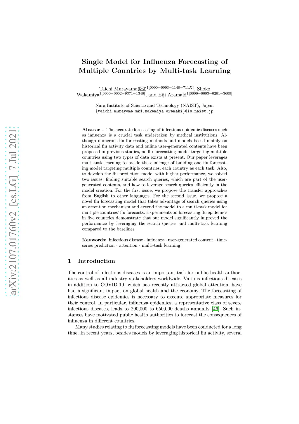 The accurate forecasting of infectious epidemic diseases such as influenza is a crucial task undertaken by medical institutions. Although numerous flu forecasting methods and models based mainly on historical flu activity data and online user-generated contents have been proposed in previous studies, no flu forecasting model targeting multiple countries using two types of data exists at present. Our paper leverages multi-task learning to tackle the challenge of building one flu forecasting model targeting multiple countries; each country as each task. Also, to develop the flu prediction model with higher performance, we solved two issues; finding suitable search queries, which are part of the user-generated contents, and how to leverage search queries efficiently in the model creation. For the first issue, we propose the transfer approaches from English to other languages. For the second issue, we propose a novel flu forecasting model that takes advantage of search queries using an attention mechanism and extend the model to a multi-task model for multiple countries' flu forecasts. Experiments on forecasting flu epidemics in five countries demonstrate that our model significantly improved the performance by leveraging the search queries and multi-task learning compared to the baselines.