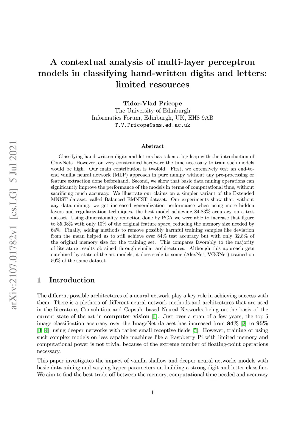 Classifying hand-written digits and letters has taken a big leap with the introduction of ConvNets. However, on very constrained hardware the time necessary to train such models would be high. Our main contribution is twofold. First, we extensively test an end-to-end vanilla neural network (MLP) approach in pure numpy without any pre-processing or feature extraction done beforehand. Second, we show that basic data mining operations can significantly improve the performance of the models in terms of computational time, without sacrificing much accuracy. We illustrate our claims on a simpler variant of the Extended MNIST dataset, called Balanced EMNIST dataset. Our experiments show that, without any data mining, we get increased generalization performance when using more hidden layers and regularization techniques, the best model achieving 84.83% accuracy on a test dataset. Using dimensionality reduction done by PCA we were able to increase that figure to 85.08% with only 10% of the original feature space, reducing the memory size needed by 64%. Finally, adding methods to remove possibly harmful training samples like deviation from the mean helped us to still achieve over 84% test accuracy but with only 32.8% of the original memory size for the training set. This compares favorably to the majority of literature results obtained through similar architectures. Although this approach gets outshined by state-of-the-art models, it does scale to some (AlexNet, VGGNet) trained on 50% of the same dataset.