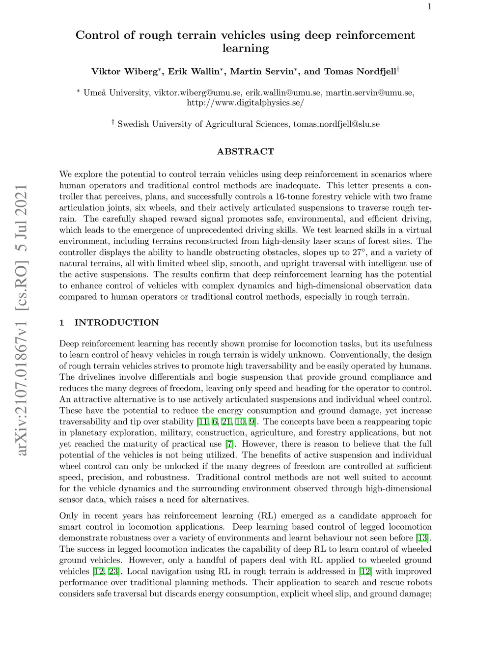 We explore the potential to control terrain vehicles using deep reinforcement in scenarios where human operators and traditional control methods are inadequate. This letter presents a controller that perceives, plans, and successfully controls a 16-tonne forestry vehicle with two frame articulation joints, six wheels, and their actively articulated suspensions to traverse rough terrain. The carefully shaped reward signal promotes safe, environmental, and efficient driving, which leads to the emergence of unprecedented driving skills. We test learned skills in a virtual environment, including terrains reconstructed from high-density laser scans of forest sites. The controller displays the ability to handle obstructing obstacles, slopes up to 27, and a variety of natural terrains, all with limited wheel slip, smooth, and upright traversal with intelligent use of the active suspensions. The results confirm that deep reinforcement learning has the potential to enhance control of vehicles with complex dynamics and high-dimensional observation data compared to human operators or traditional control methods, especially in rough terrain.