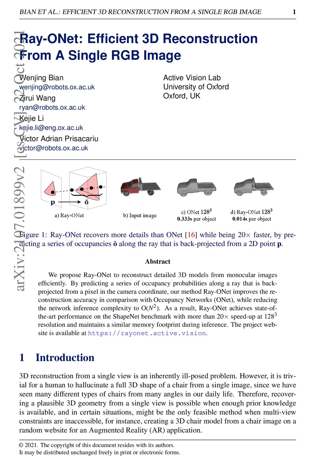 Ray-ONet: Efficient 3D Reconstruction From A Single RGB Image