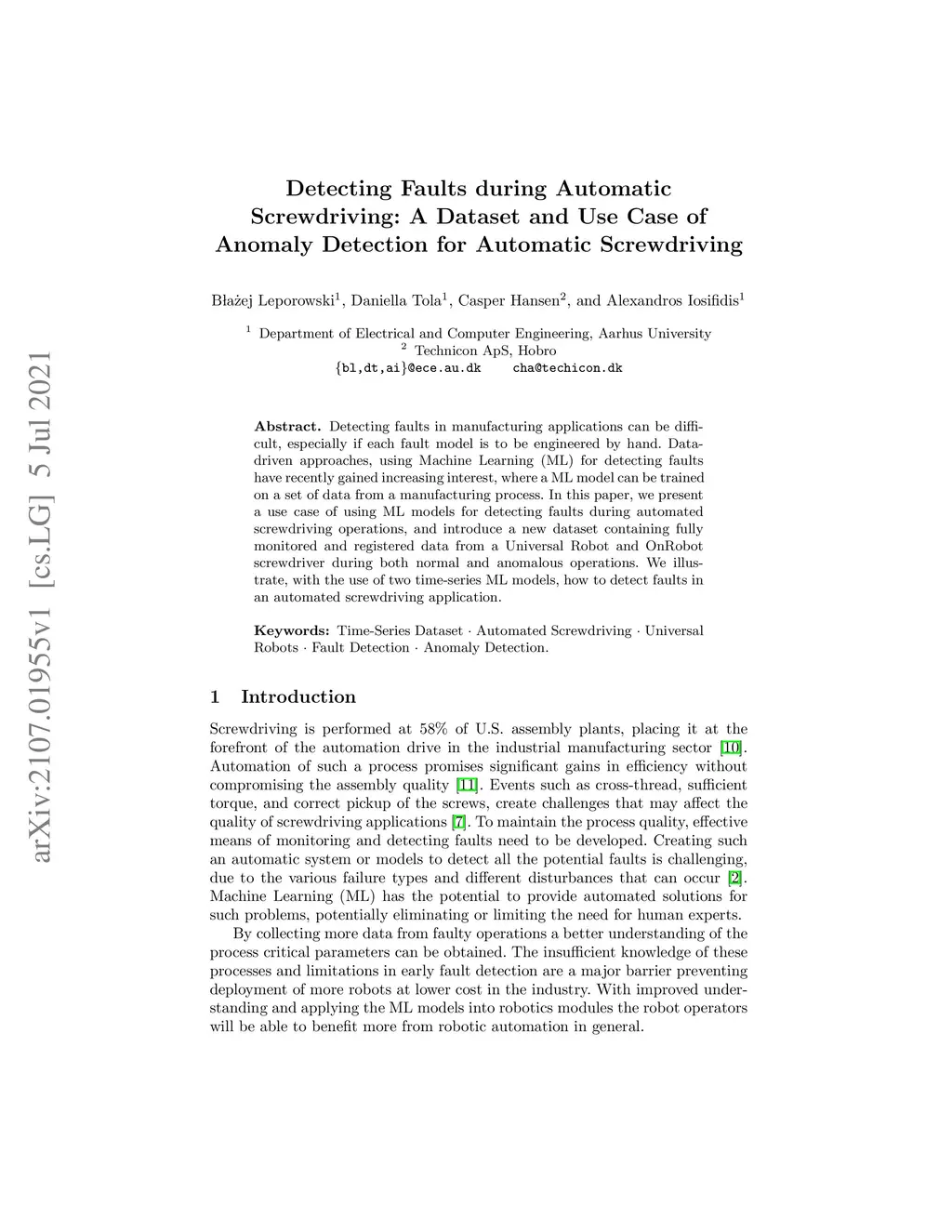 Detecting faults in manufacturing applications can be difficult, especially if each fault model is to be engineered by hand. Data-driven approaches, using Machine Learning (ML) for detecting faults have recently gained increasing interest, where a ML model can be trained on a set of data from a manufacturing process. In this paper, we present a use case of using ML models for detecting faults during automated screwdriving operations, and introduce a new dataset containing fully monitored and registered data from a Universal Robot and OnRobot screwdriver during both normal and anomalous operations. We illustrate, with the use of two time-series ML models, how to detect faults in an automated screwdriving application.
