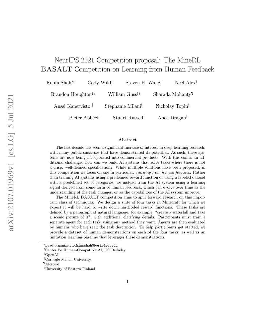 The last decade has seen a significant increase of interest in deep learning research, with many public successes that have demonstrated its potential. As such, these systems are now being incorporated into commercial products. With this comes an additional challenge: how can we build AI systems that solve tasks where there is not a crisp, well-defined specification? While multiple solutions have been proposed, in this competition we focus on one in particular: learning from human feedback. Rather than training AI systems using a predefined reward function or using a labeled dataset with a predefined set of categories, we instead train the AI system using a learning signal derived from some form of human feedback, which can evolve over time as the understanding of the task changes, or as the capabilities of the AI system improve. The MineRL BASALT competition aims to spur forward research on this important class of techniques. We design a suite of four tasks in Minecraft for which we expect it will be hard to write down hardcoded reward functions. These tasks are defined by a paragraph of natural language: for example, "create a waterfall and take a scenic picture of it", with additional clarifying details. Participants must train a separate agent for each task, using any method they want. Agents are then evaluated by humans who have read the task description. To help participants get started, we provide a dataset of human demonstrations on each of the four tasks, as well as an imitation learning baseline that leverages these demonstrations. Our hope is that this competition will improve our ability to build AI systems that do what their designers intend them to do, even when the intent cannot be easily formalized. Besides allowing AI to solve more tasks, this can also enable more effective regulation of AI systems, as well as making progress on the value alignment problem.