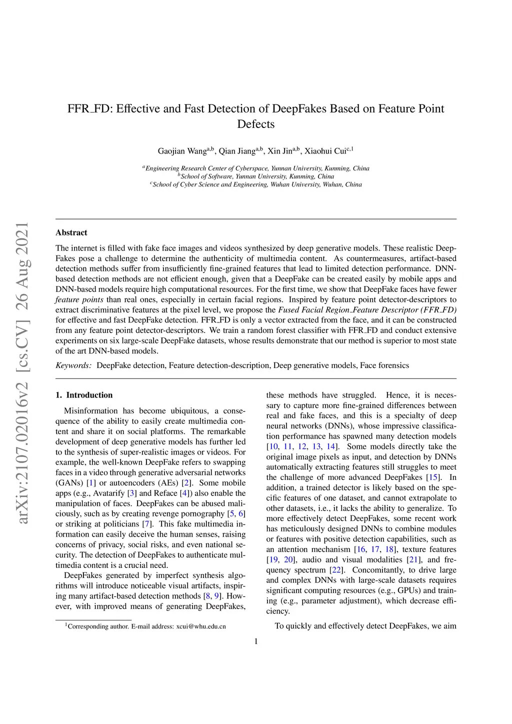 FFR_FD: Effective and Fast Detection of DeepFakes Based on Feature Point