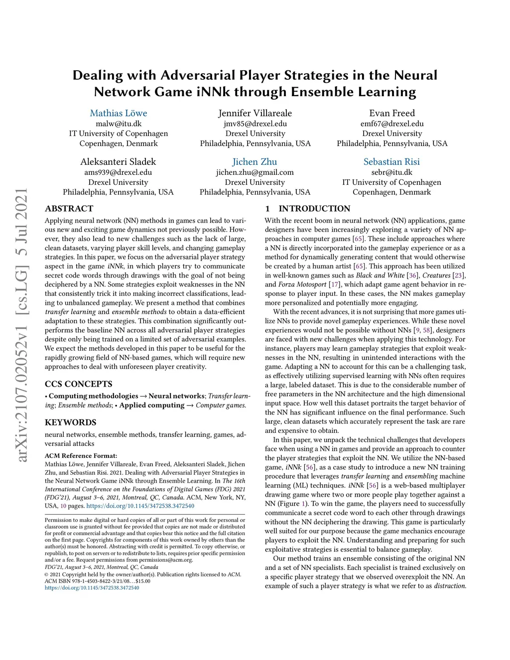 Applying neural network (NN) methods in games can lead to various new and exciting game dynamics not previously possible. However, they also lead to new challenges such as the lack of large, clean datasets, varying player skill levels, and changing gameplay strategies. In this paper, we focus on the adversarial player strategy aspect in the game iNNk, in which players try to communicate secret code words through drawings with the goal of not being deciphered by a NN. Some strategies exploit weaknesses in the NN that consistently trick it into making incorrect classifications, leading to unbalanced gameplay. We present a method that combines transfer learning and ensemble methods to obtain a data-efficient adaptation to these strategies. This combination significantly outperforms the baseline NN across all adversarial player strategies despite only being trained on a limited set of adversarial examples. We expect the methods developed in this paper to be useful for the rapidly growing field of NN-based games, which will require new approaches to deal with unforeseen player creativity.