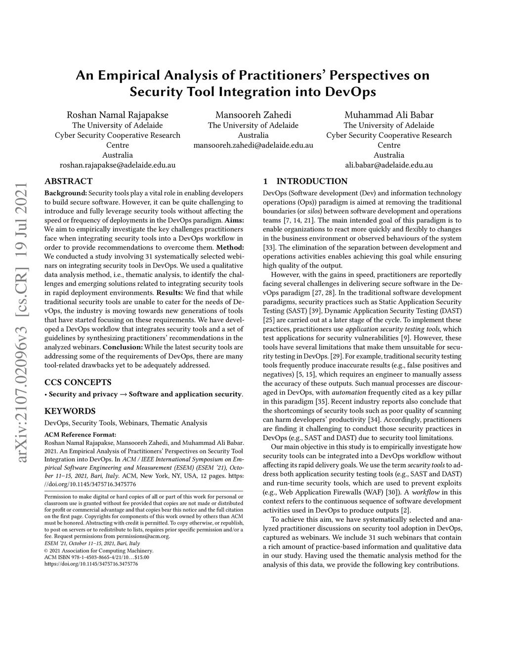 Background: Security tools play a vital role in enabling developers to build secure software. However, it can be quite challenging to introduce and fully leverage security tools without affecting the speed or frequency of deployments in the DevOps paradigm. Aims: We aim to empirically investigate the key challenges practitioners face when integrating security tools into a DevOps workflow in order to provide recommendations to overcome them. Method: We conducted a study involving 31 systematically selected webinars on integrating security tools in DevOps. We used a qualitative data analysis method, i.e., thematic analysis, to identify the challenges and emerging solutions related to integrating security tools in rapid deployment environments. Results: We find that while traditional security tools are unable to cater for the needs of DevOps, the industry is moving towards new generations of tools that have started focusing on these requirements. We have developed a DevOps workflow that integrates security tools and a set of guidelines by synthesizing practitioners' recommendations in the analyzed webinars. Conclusion: While the latest security tools are addressing some of the requirements of DevOps, there are many tool-related drawbacks yet to be adequately addressed.