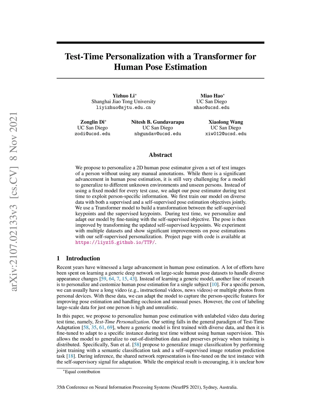 Test-Time Personalization with a Transformer for Human Pose Estimation