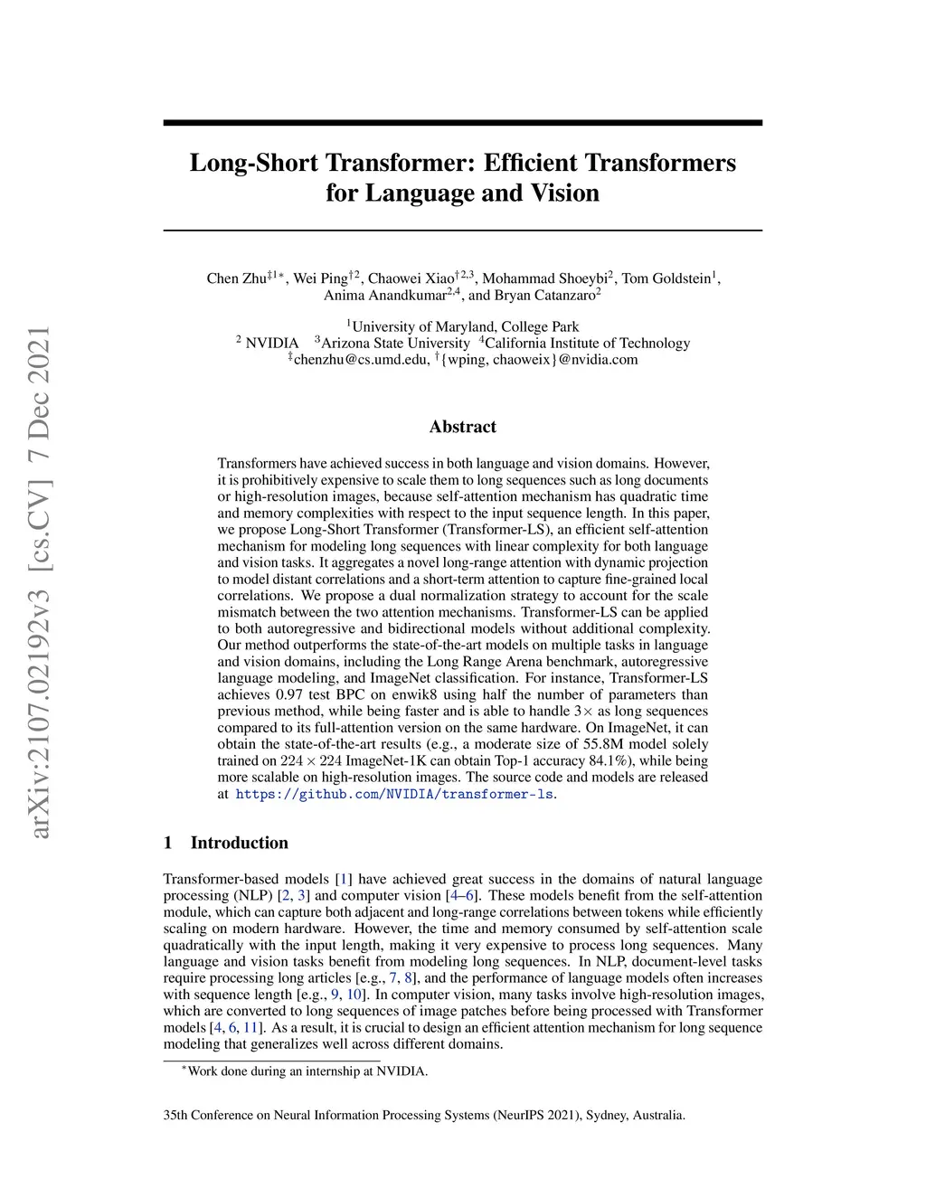 Long-Short Transformer: Efficient Transformers for Language and Vision