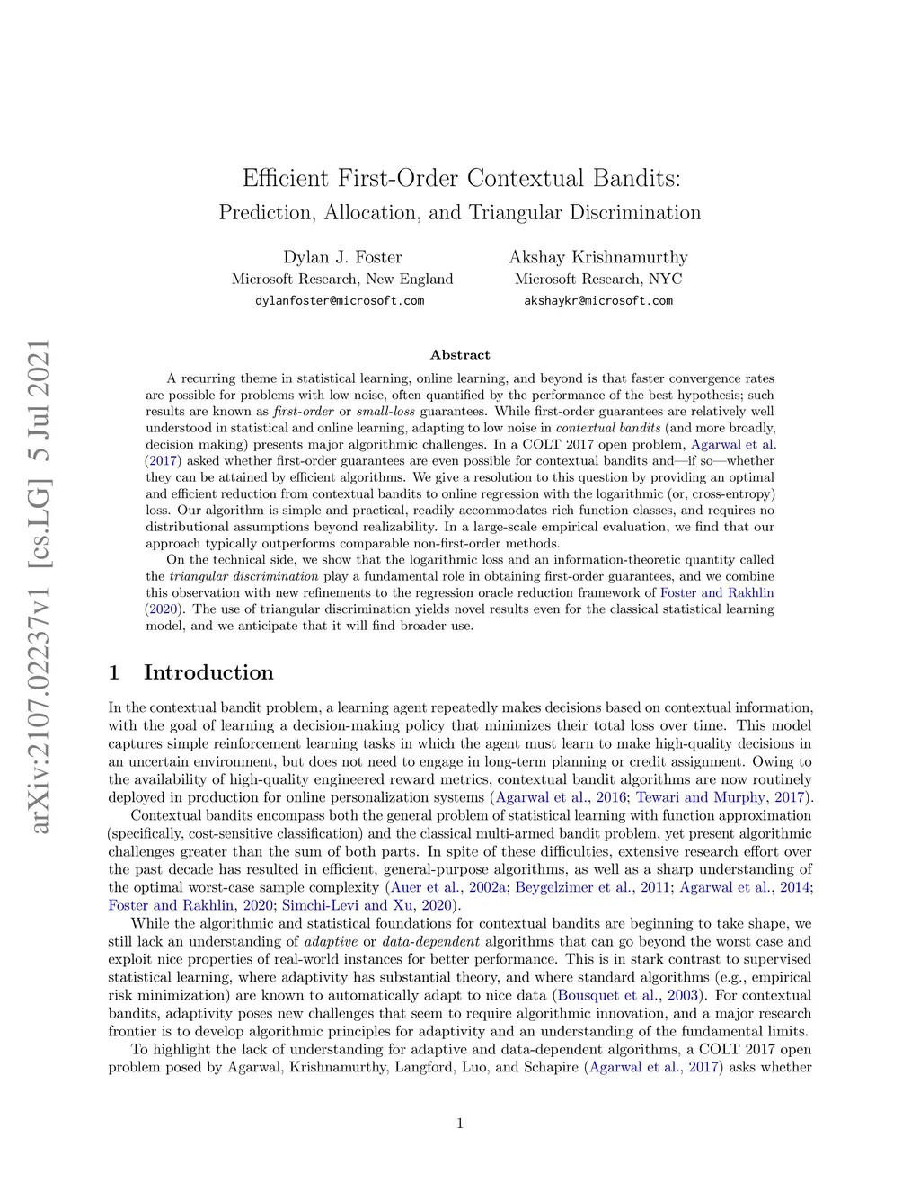 A recurring theme in statistical learning, online learning, and beyond is that faster convergence rates are possible for problems with low noise, often quantified by the performance of the best hypothesis; such results are known as first-order or small-loss guarantees. While first-order guarantees are relatively well understood in statistical and online learning, adapting to low noise in contextual bandits (and more broadly, decision making) presents major algorithmic challenges. In a COLT 2017 open problem, Agarwal, Krishnamurthy, Langford, Luo, and Schapire asked whether first-order guarantees are even possible for contextual bandits and -- if so -- whether they can be attained by efficient algorithms. We give a resolution to this question by providing an optimal and efficient reduction from contextual bandits to online regression with the logarithmic (or, cross-entropy) loss. Our algorithm is simple and practical, readily accommodates rich function classes, and requires no distributional assumptions beyond realizability. In a large-scale empirical evaluation, we find that our approach typically outperforms comparable non-first-order methods. On the technical side, we show that the logarithmic loss and an information-theoretic quantity called the triangular discrimination play a fundamental role in obtaining first-order guarantees, and we combine this observation with new refinements to the regression oracle reduction framework of Foster and Rakhlin. The use of triangular discrimination yields novel results even for the classical statistical learning model, and we anticipate that it will find broader use.