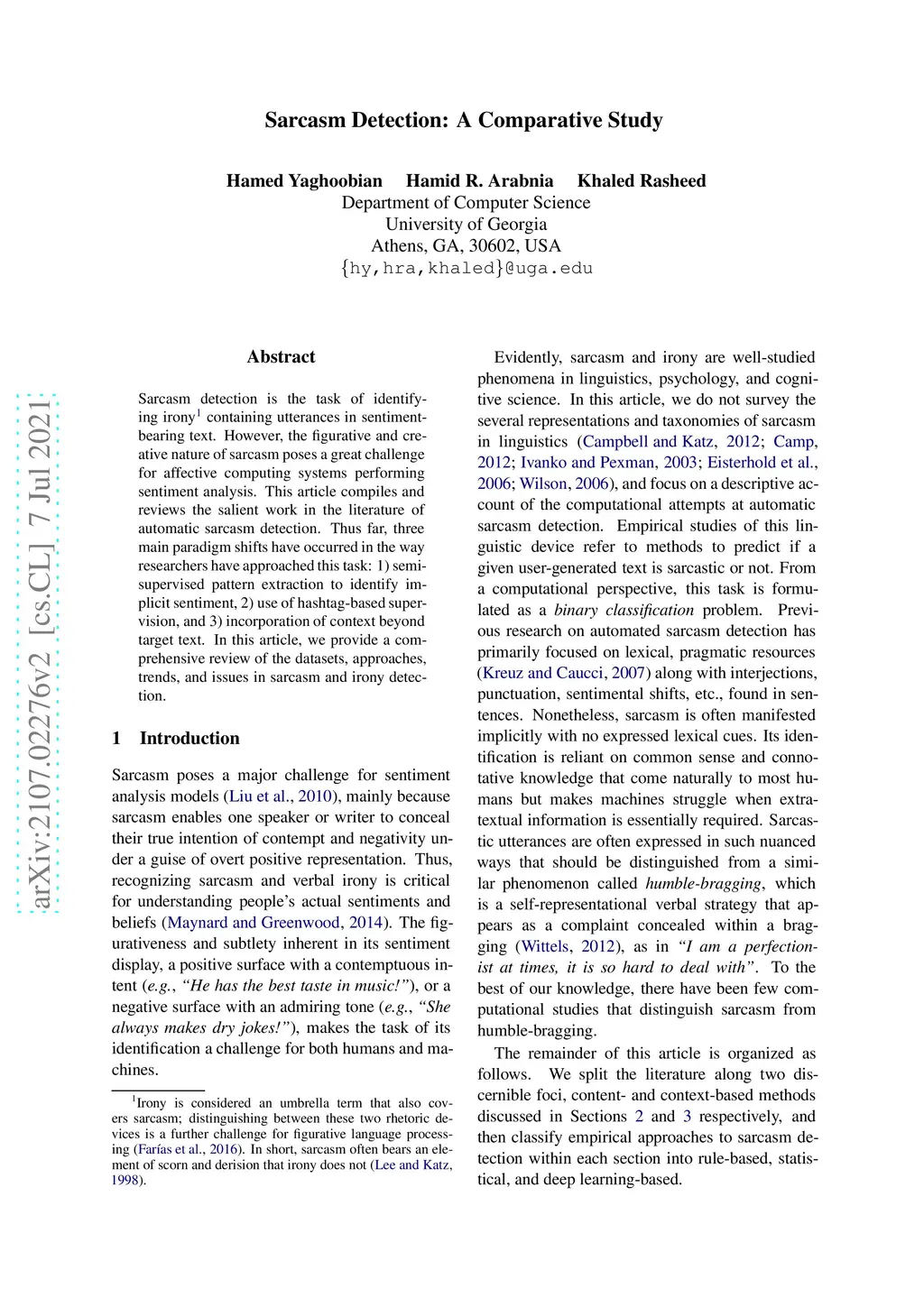 Sarcasm detection is the task of identifying irony containing utterances in sentiment-bearing text. However, the figurative and creative nature of sarcasm poses a great challenge for affective computing systems performing sentiment analysis. This article compiles and reviews the salient work in the literature of automatic sarcasm detection. Thus far, three main paradigm shifts have occurred in the way researchers have approached this task: 1) semi-supervised pattern extraction to identify implicit sentiment, 2) use of hashtag-based supervision, and 3) incorporation of context beyond target text. In this article, we provide a comprehensive review of the datasets, approaches, trends, and issues in sarcasm and irony detection.