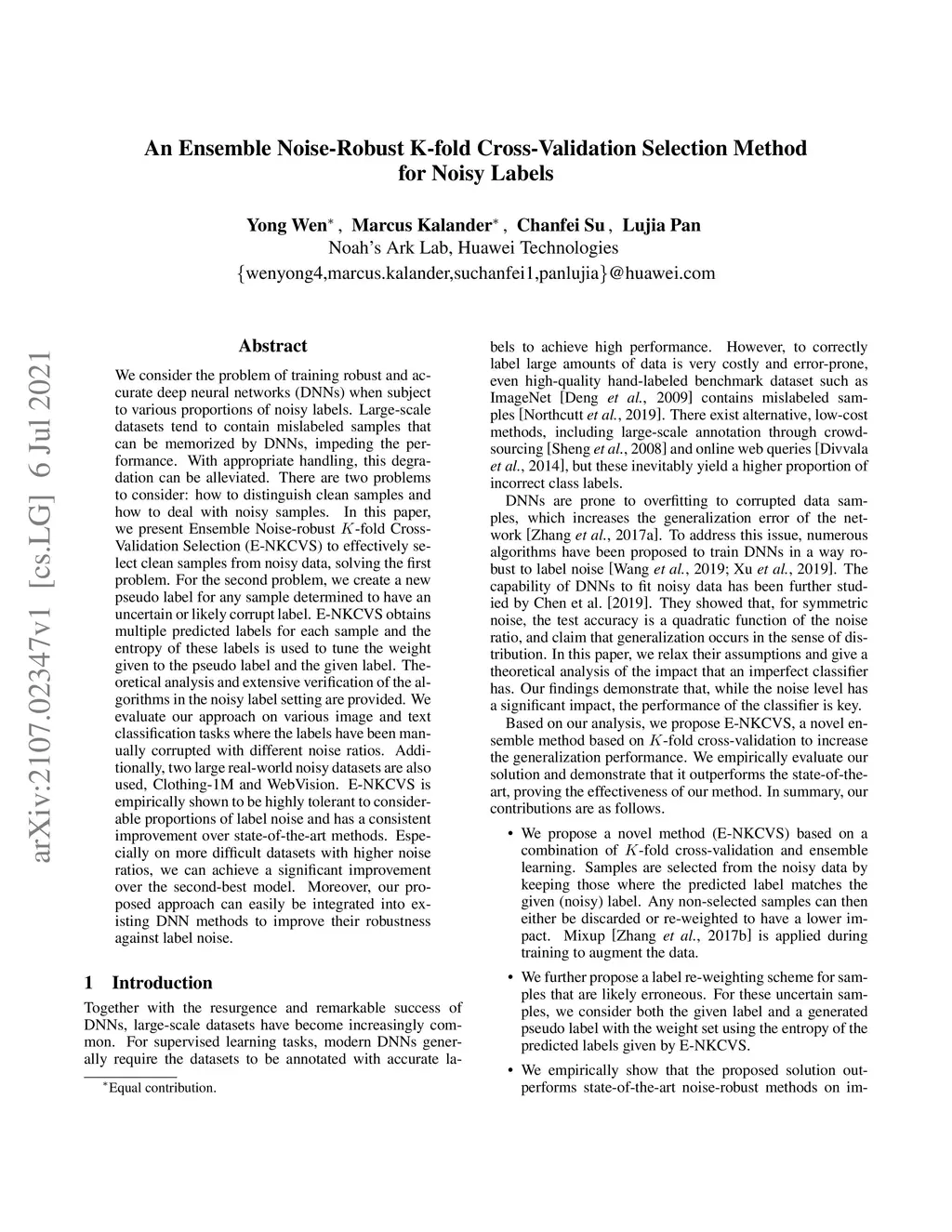 We consider the problem of training robust and accurate deep neural networks (DNNs) when subject to various proportions of noisy labels. Large-scale datasets tend to contain mislabeled samples that can be memorized by DNNs, impeding the performance. With appropriate handling, this degradation can be alleviated. There are two problems to consider: how to distinguish clean samples and how to deal with noisy samples. In this paper, we present Ensemble Noise-robust K-fold Cross-Validation Selection (E-NKCVS) to effectively select clean samples from noisy data, solving the first problem. For the second problem, we create a new pseudo label for any sample determined to have an uncertain or likely corrupt label. E-NKCVS obtains multiple predicted labels for each sample and the entropy of these labels is used to tune the weight given to the pseudo label and the given label. Theoretical analysis and extensive verification of the algorithms in the noisy label setting are provided. We evaluate our approach on various image and text classification tasks where the labels have been manually corrupted with different noise ratios. Additionally, two large real-world noisy datasets are also used, Clothing-1M and WebVision. E-NKCVS is empirically shown to be highly tolerant to considerable proportions of label noise and has a consistent improvement over state-of-the-art methods. Especially on more difficult datasets with higher noise ratios, we can achieve a significant improvement over the second-best model. Moreover, our proposed approach can easily be integrated into existing DNN methods to improve their robustness against label noise.
