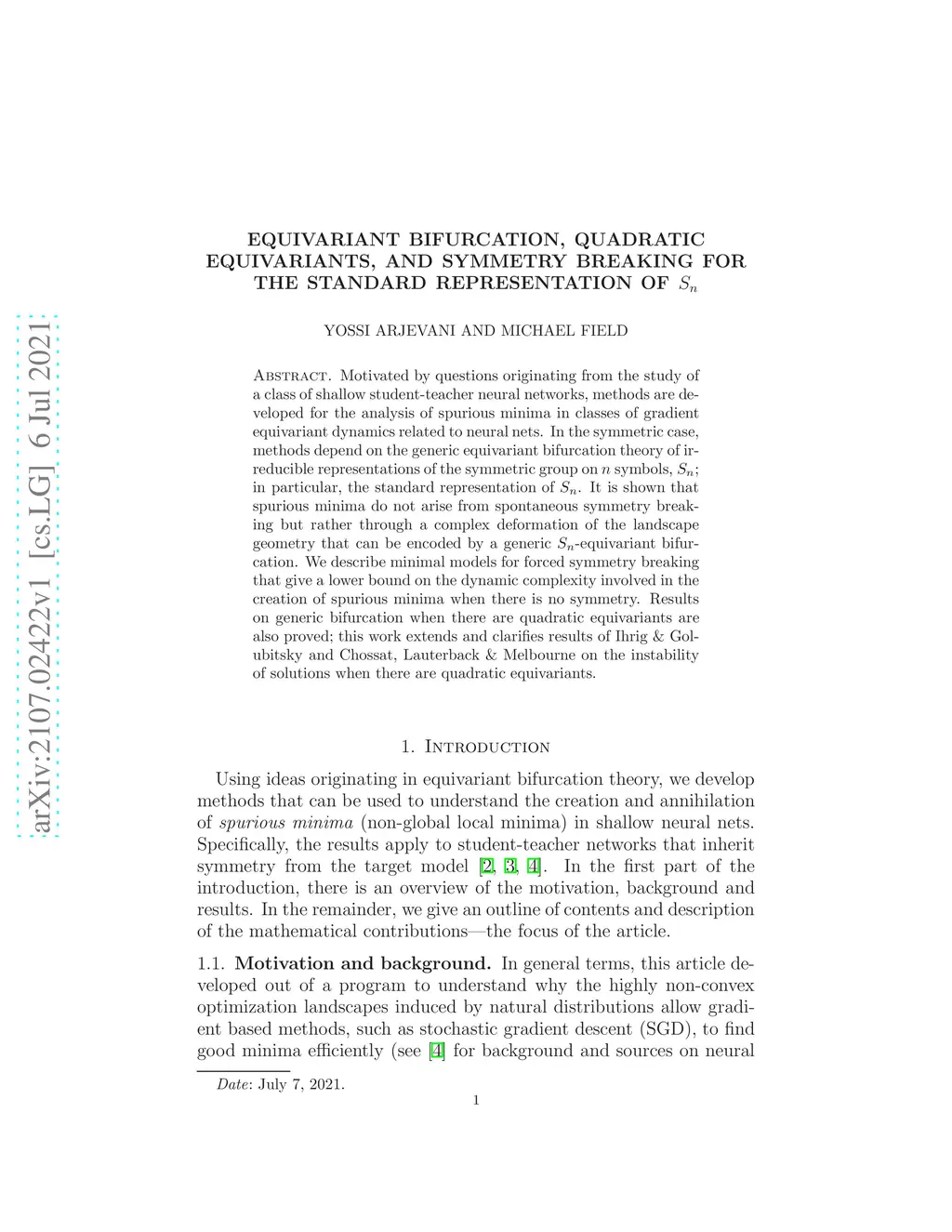 Motivated by questions originating from the study of a class of shallow student-teacher neural networks, methods are developed for the analysis of spurious minima in classes of gradient equivariant dynamics related to neural nets. In the symmetric case, methods depend on the generic equivariant bifurcation theory of irreducible representations of the symmetric group on symbols, ; in particular, the standard representation of . It is shown that spurious minima do not arise from spontaneous symmetry breaking but rather through a complex deformation of the landscape geometry that can be encoded by a generic -equivariant bifurcation. We describe minimal models for forced symmetry breaking that give a lower bound on the dynamic complexity involved in the creation of spurious minima when there is no symmetry. Results on generic bifurcation when there are quadratic equivariants are also proved; this work extends and clarifies results of Ihrig & Golubitsky and Chossat, Lauterback & Melbourne on the instability of solutions when there are quadratic equivariants.