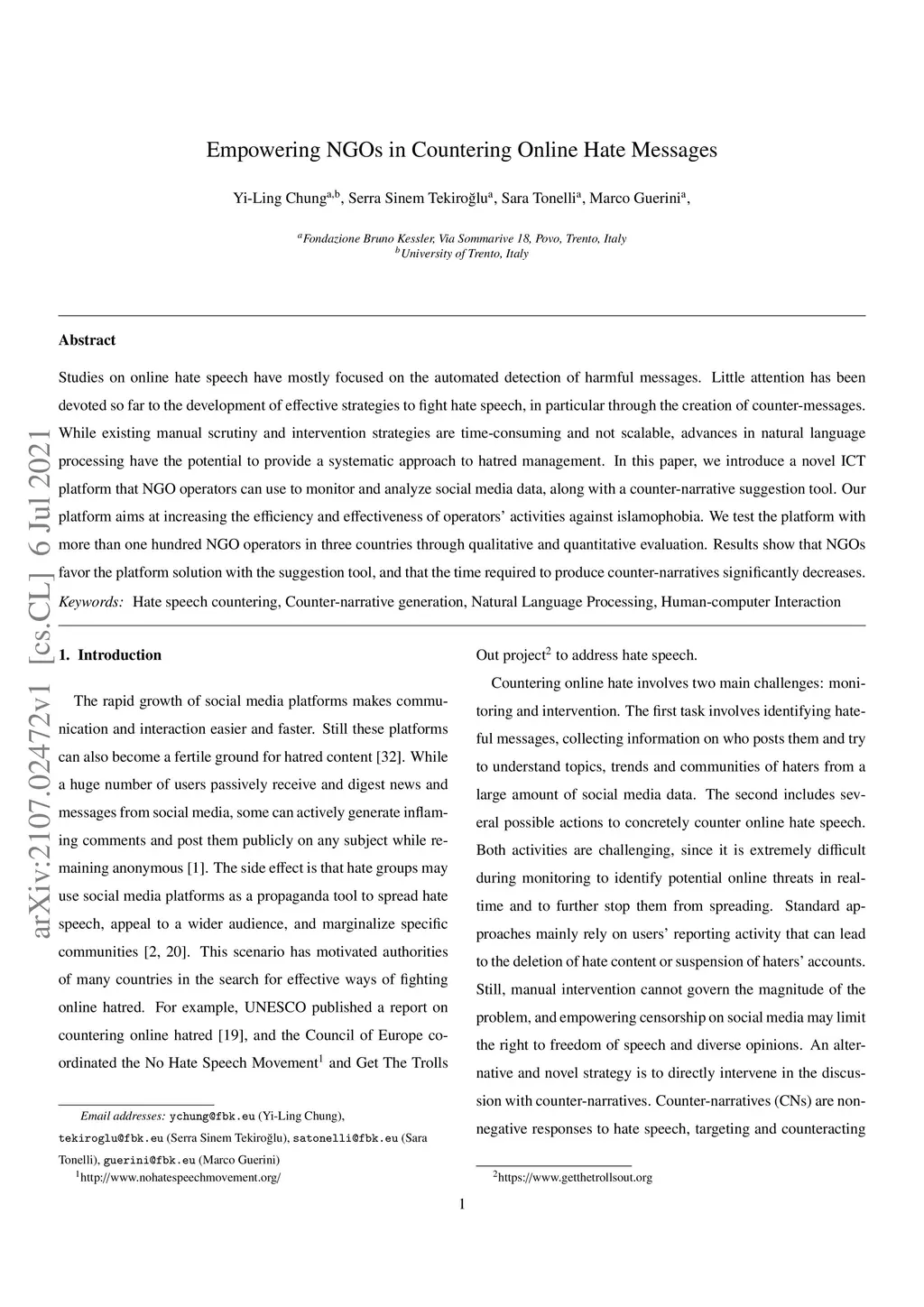 Studies on online hate speech have mostly focused on the automated detection of harmful messages. Little attention has been devoted so far to the development of effective strategies to fight hate speech, in particular through the creation of counter-messages. While existing manual scrutiny and intervention strategies are time-consuming and not scalable, advances in natural language processing have the potential to provide a systematic approach to hatred management. In this paper, we introduce a novel ICT platform that NGO operators can use to monitor and analyze social media data, along with a counter-narrative suggestion tool. Our platform aims at increasing the efficiency and effectiveness of operators' activities against islamophobia. We test the platform with more than one hundred NGO operators in three countries through qualitative and quantitative evaluation. Results show that NGOs favor the platform solution with the suggestion tool, and that the time required to produce counter-narratives significantly decreases.