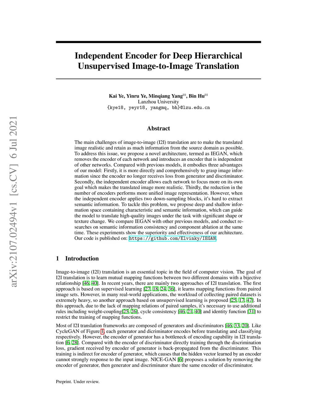 The main challenges of image-to-image (I2I) translation are to make the translated image realistic and retain as much information from the source domain as possible. To address this issue, we propose a novel architecture, termed as IEGAN, which removes the encoder of each network and introduces an encoder that is independent of other networks. Compared with previous models, it embodies three advantages of our model: Firstly, it is more directly and comprehensively to grasp image information since the encoder no longer receives loss from generator and discriminator. Secondly, the independent encoder allows each network to focus more on its own goal which makes the translated image more realistic. Thirdly, the reduction in the number of encoders performs more unified image representation. However, when the independent encoder applies two down-sampling blocks, it's hard to extract semantic information. To tackle this problem, we propose deep and shallow information space containing characteristic and semantic information, which can guide the model to translate high-quality images under the task with significant shape or texture change. We compare IEGAN with other previous models, and conduct researches on semantic information consistency and component ablation at the same time. These experiments show the superiority and effectiveness of our architecture. Our code is published on: https://github.com/Elvinky/IEGAN.