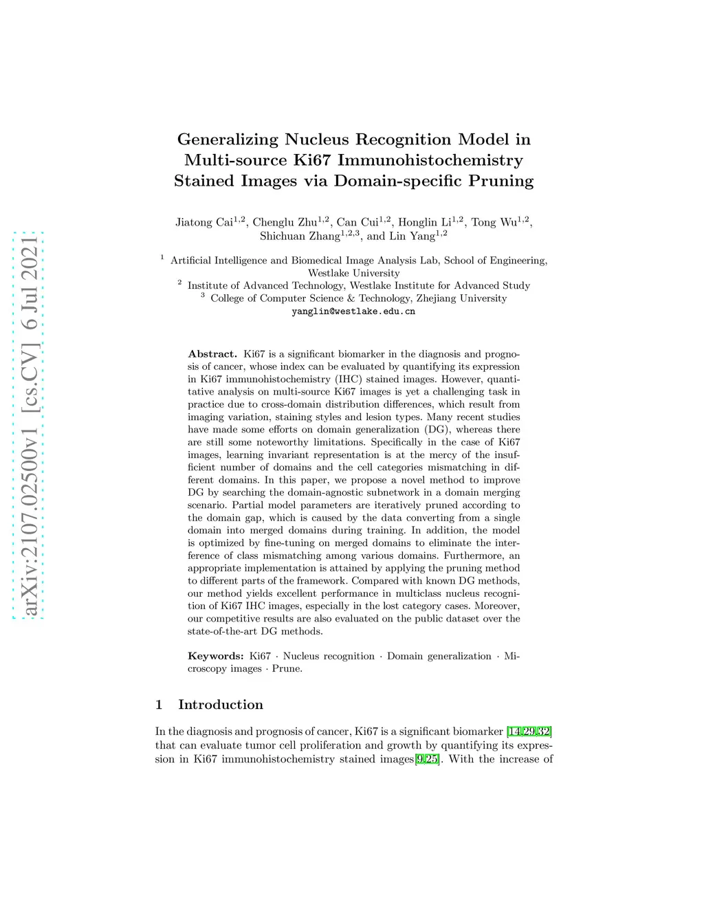 Ki67 is a significant biomarker in the diagnosis and prognosis of cancer, whose index can be evaluated by quantifying its expression in Ki67 immunohistochemistry (IHC) stained images. However, quantitative analysis on multi-source Ki67 images is yet a challenging task in practice due to cross-domain distribution differences, which result from imaging variation, staining styles, and lesion types. Many recent studies have made some efforts on domain generalization (DG), whereas there are still some noteworthy limitations. Specifically in the case of Ki67 images, learning invariant representation is at the mercy of the insufficient number of domains and the cell categories mismatching in different domains. In this paper, we propose a novel method to improve DG by searching the domain-agnostic subnetwork in a domain merging scenario. Partial model parameters are iteratively pruned according to the domain gap, which is caused by the data converting from a single domain into merged domains during training. In addition, the model is optimized by fine-tuning on merged domains to eliminate the interference of class mismatching among various domains. Furthermore, an appropriate implementation is attained by applying the pruning method to different parts of the framework. Compared with known DG methods, our method yields excellent performance in multiclass nucleus recognition of Ki67 IHC images, especially in the lost category cases. Moreover, our competitive results are also evaluated on the public dataset over the state-of-the-art DG methods.