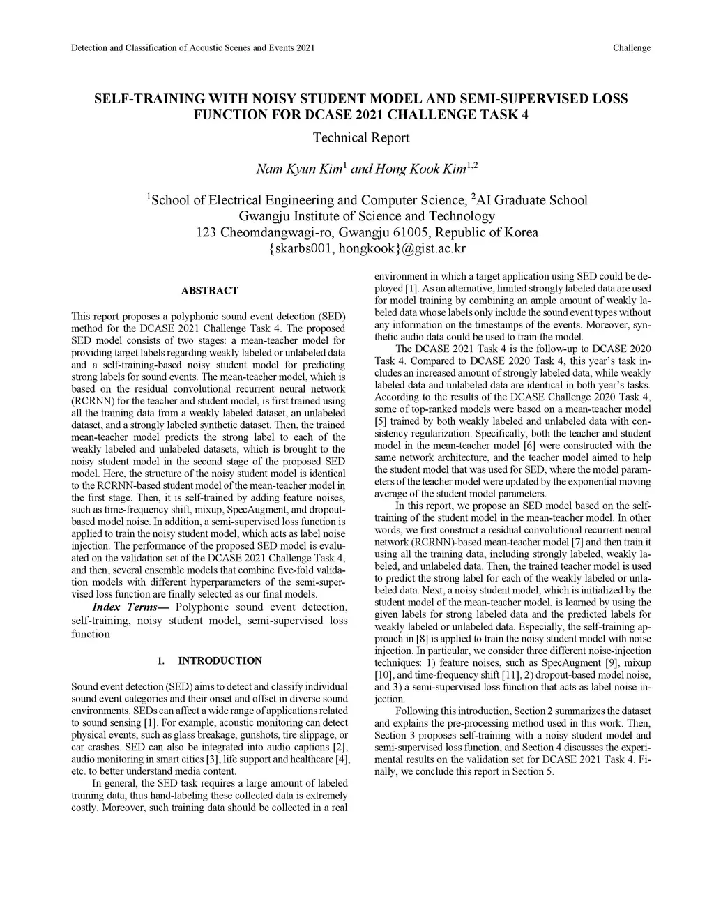 This report proposes a polyphonic sound event detection (SED) method for the DCASE 2021 Challenge Task 4. The proposed SED model consists of two stages: a mean-teacher model for providing target labels regarding weakly labeled or unlabeled data and a self-training-based noisy student model for predicting strong labels for sound events. The mean-teacher model, which is based on the residual convolutional recurrent neural network (RCRNN) for the teacher and student model, is first trained using all the training data from a weakly labeled dataset, an unlabeled dataset, and a strongly labeled synthetic dataset. Then, the trained mean-teacher model predicts the strong label to each of the weakly labeled and unlabeled datasets, which is brought to the noisy student model in the second stage of the proposed SED model. Here, the structure of the noisy student model is identical to the RCRNN-based student model of the mean-teacher model in the first stage. Then, it is self-trained by adding feature noises, such as time-frequency shift, mixup, SpecAugment, and dropout-based model noise. In addition, a semi-supervised loss function is applied to train the noisy student model, which acts as label noise injection. The performance of the proposed SED model is evaluated on the validation set of the DCASE 2021 Challenge Task 4, and then, several ensemble models that combine five-fold validation models with different hyperparameters of the semi-supervised loss function are finally selected as our final models.