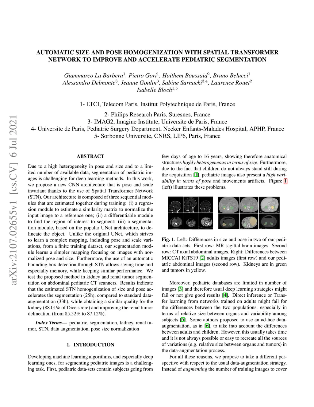 Due to a high heterogeneity in pose and size and to a limited number of available data, segmentation of pediatric images is challenging for deep learning methods. In this work, we propose a new CNN architecture that is pose and scale invariant thanks to the use of Spatial Transformer Network (STN). Our architecture is composed of three sequential modules that are estimated together during training: (i) a regression module to estimate a similarity matrix to normalize the input image to a reference one; (ii) a differentiable module to find the region of interest to segment; (iii) a segmentation module, based on the popular UNet architecture, to delineate the object. Unlike the original UNet, which strives to learn a complex mapping, including pose and scale variations, from a finite training dataset, our segmentation module learns a simpler mapping focusing on images with normalized pose and size. Furthermore, the use of an automatic bounding box detection through STN allows saving time and especially memory, while keeping similar performance. We test the proposed method in kidney and renal tumor segmentation on abdominal pediatric CT scanners. Results indicate that the estimated STN homogenization of size and pose accelerates the segmentation (25h), compared to standard data-augmentation (33h), while obtaining a similar quality for the kidney (88.01\% of Dice score) and improving the renal tumor delineation (from 85.52\% to 87.12\%).