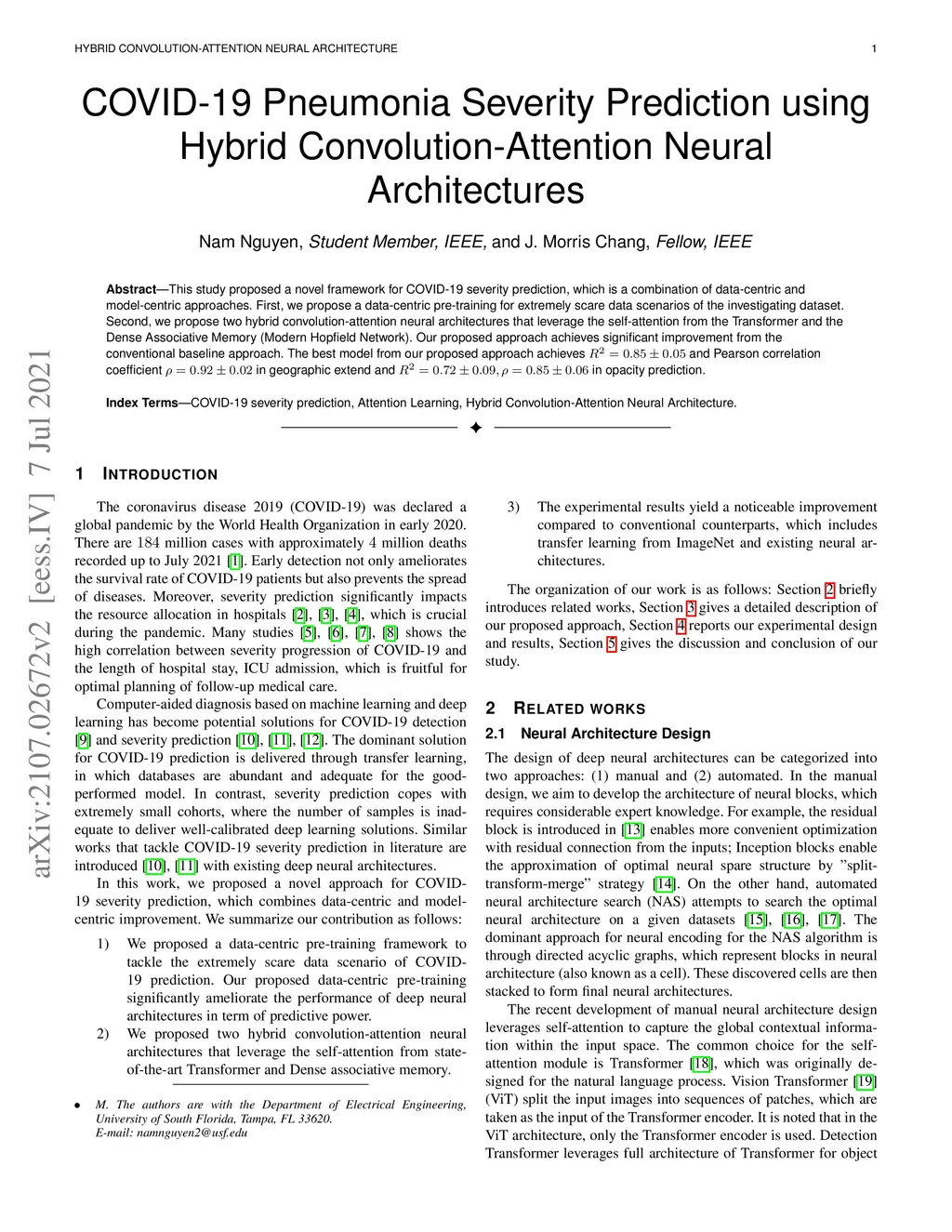 This study proposed a novel framework for COVID-19 severity prediction, which is a combination of data-centric and model-centric approaches. First, we propose a data-centric pre-training for extremely scare data scenarios of the investigating dataset. Second, we propose two hybrid convolution-attention neural architectures that leverage the self-attention from the Transformer and the Dense Associative Memory (Modern Hopfield networks). Our proposed approach achieves significant improvement from the conventional baseline approach. The best model from our proposed approach achieves and Pearson correlation coefficient in geographic extend and in opacity prediction.