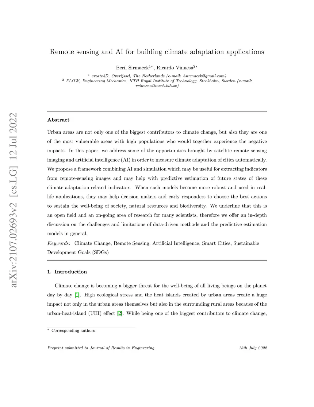 Urban areas are not only one of the biggest contributors to climate change, but also they are one of the most vulnerable areas with high populations who would together experience the negative impacts. In this paper, we address some of the opportunities brought by satellite remote sensing imaging and artificial intelligence (AI) in order to measure climate adaptation of cities automatically. We propose a framework combining AI and simulation which may be useful for extracting indicators from remote-sensing images and may help with predictive estimation of future states of these climate-adaptation-related indicators. When such models become more robust and used in real life applications, they may help decision makers and early responders to choose the best actions to sustain the well-being of society, natural resources and biodiversity. We underline that this is an open field and an on-going area of research for many scientists, therefore we offer an in-depth discussion on the challenges and limitations of data-driven methods and the predictive estimation models in general.