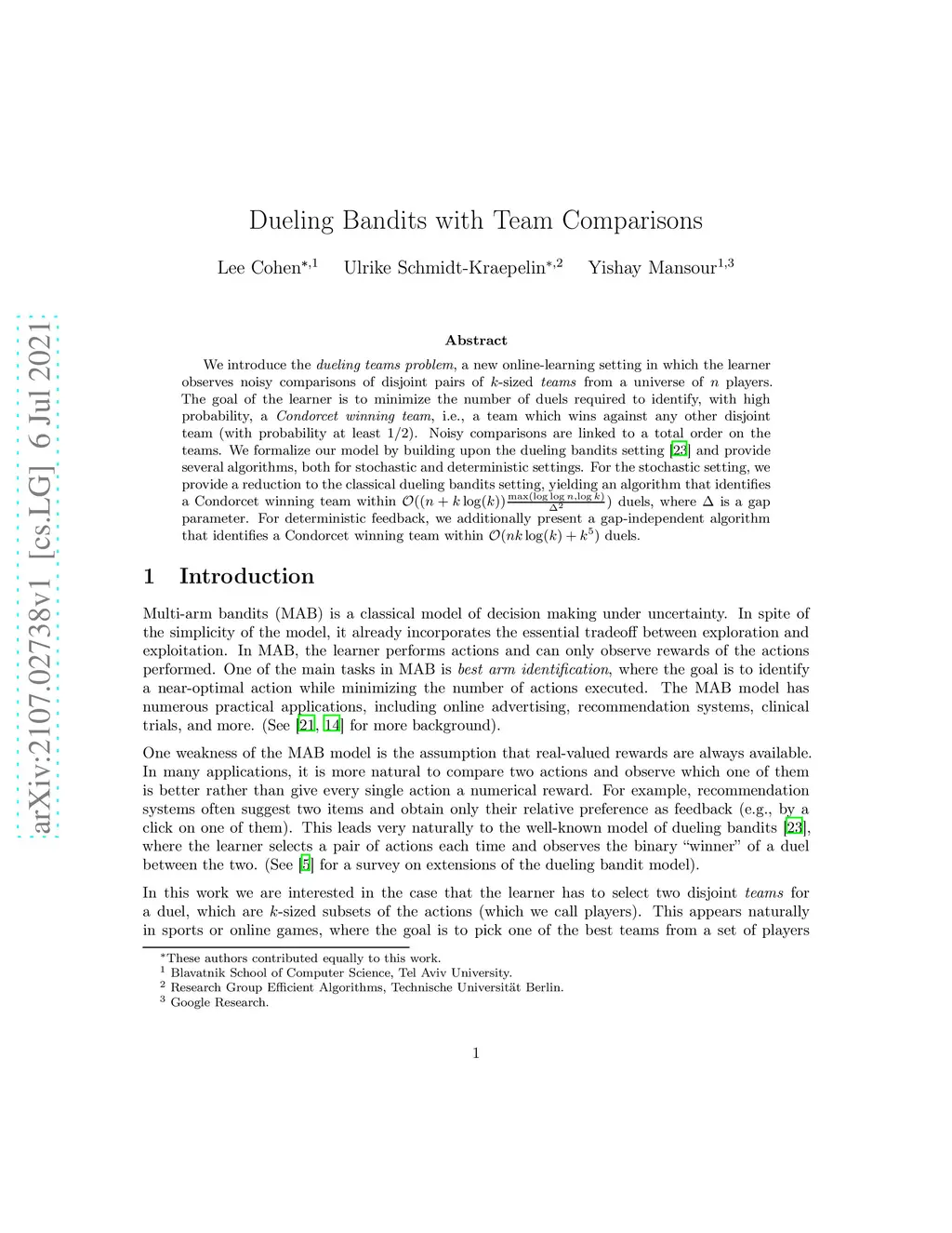 We introduce the dueling teams problem, a new online-learning setting in which the learner observes noisy comparisons of disjoint pairs of -sized teams from a universe of players. The goal of the learner is to minimize the number of duels required to identify, with high probability, a Condorcet winning team, i.e., a team which wins against any other disjoint team (with probability at least ). Noisy comparisons are linked to a total order on the teams. We formalize our model by building upon the dueling bandits setting (Yue et al.2012) and provide several algorithms, both for stochastic and deterministic settings. For the stochastic setting, we provide a reduction to the classical dueling bandits setting, yielding an algorithm that identifies a Condorcet winning team within duels, where is a gap parameter. For deterministic feedback, we additionally present a gap-independent algorithm that identifies a Condorcet winning team within duels.