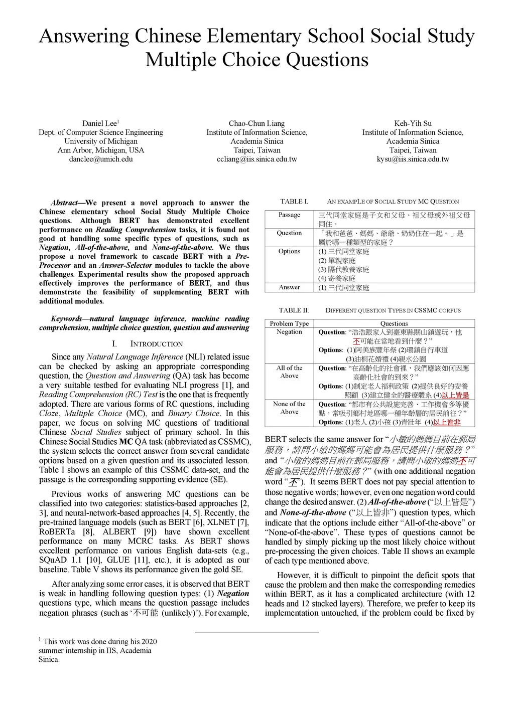 We present a novel approach to answer the Chinese elementary school Social Study Multiple Choice questions. Although BERT has demonstrated excellent performance on Reading Comprehension tasks, it is found not good at handling some specific types of questions, such as Negation, All-of-the-above, and None-of-the-above. We thus propose a novel framework to cascade BERT with a Pre-Processor and an Answer-Selector modules to tackle the above challenges. Experimental results show the proposed approach effectively improves the performance of BERT, and thus demonstrate the feasibility of supplementing BERT with additional modules.