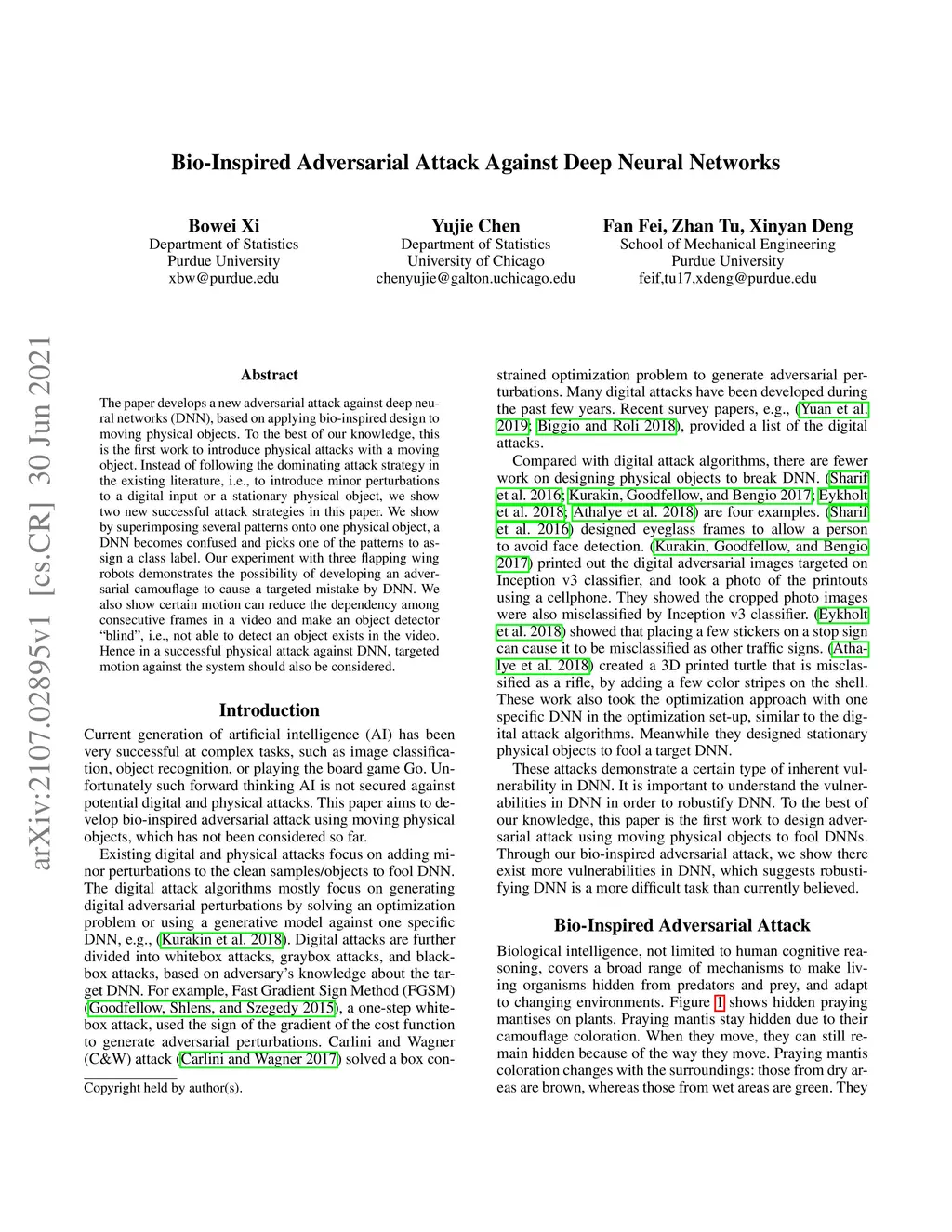 The paper develops a new adversarial attack against deep neural networks (DNN), based on applying bio-inspired design to moving physical objects. To the best of our knowledge, this is the first work to introduce physical attacks with a moving object. Instead of following the dominating attack strategy in the existing literature, i.e., to introduce minor perturbations to a digital input or a stationary physical object, we show two new successful attack strategies in this paper. We show by superimposing several patterns onto one physical object, a DNN becomes confused and picks one of the patterns to assign a class label. Our experiment with three flapping wing robots demonstrates the possibility of developing an adversarial camouflage to cause a targeted mistake by DNN. We also show certain motion can reduce the dependency among consecutive frames in a video and make an object detector "blind", i.e., not able to detect an object exists in the video. Hence in a successful physical attack against DNN, targeted motion against the system should also be considered.