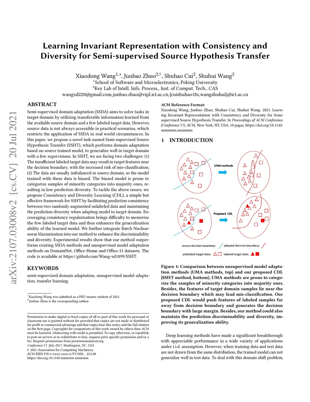 Semi-supervised domain adaptation (SSDA) aims to solve tasks in target domain by utilizing transferable information learned from the available source domain and a few labeled target data. However, source data is not always accessible in practical scenarios, which restricts the application of SSDA in real world circumstances. In this paper, we propose a novel task named Semi-supervised Source Hypothesis Transfer (SSHT), which performs domain adaptation based on source trained model, to generalize well in target domain with a few supervisions. In SSHT, we are facing two challenges: (1) The insufficient labeled target data may result in target features near the decision boundary, with the increased risk of mis-classification; (2) The data are usually imbalanced in source domain, so the model trained with these data is biased. The biased model is prone to categorize samples of minority categories into majority ones, resulting in low prediction diversity. To tackle the above issues, we propose Consistency and Diversity Learning (CDL), a simple but effective framework for SSHT by facilitating prediction consistency between two randomly augmented unlabeled data and maintaining the prediction diversity when adapting model to target domain. Encouraging consistency regularization brings difficulty to memorize the few labeled target data and thus enhances the generalization ability of the learned model. We further integrate Batch Nuclear-norm Maximization into our method to enhance the discriminability and diversity. Experimental results show that our method outperforms existing SSDA methods and unsupervised model adaptation methods on DomainNet, Office-Home and Office-31 datasets. The code is available at https://github.com/Wang-xd1899/SSHT.