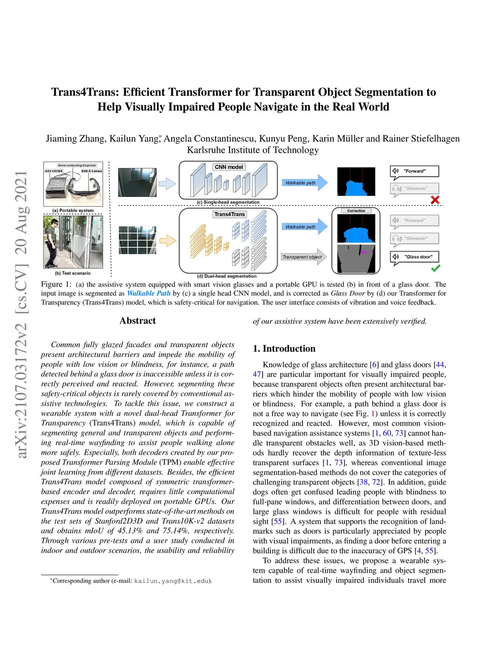 Common fully glazed facades and transparent objects present architectural barriers and impede the mobility of people with low vision or blindness, for instance, a path detected behind a glass door is inaccessible unless it is correctly perceived and reacted. However, segmenting these safety-critical objects is rarely covered by conventional assistive technologies. To tackle this issue, we construct a wearable system with a novel dual-head Transformer for Transparency (Trans4Trans) model, which is capable of segmenting general and transparent objects and performing real-time wayfinding to assist people walking alone more safely. Especially, both decoders created by our proposed Transformer Parsing Module (TPM) enable effective joint learning from different datasets. Besides, the efficient Trans4Trans model composed of symmetric transformer-based encoder and decoder, requires little computational expenses and is readily deployed on portable GPUs. Our Trans4Trans model outperforms state-of-the-art methods on the test sets of Stanford2D3D and Trans10K-v2 datasets and obtains mIoU of 45.13% and 75.14%, respectively. Through various pre-tests and a user study conducted in indoor and outdoor scenarios, the usability and reliability of our assistive system have been extensively verified.