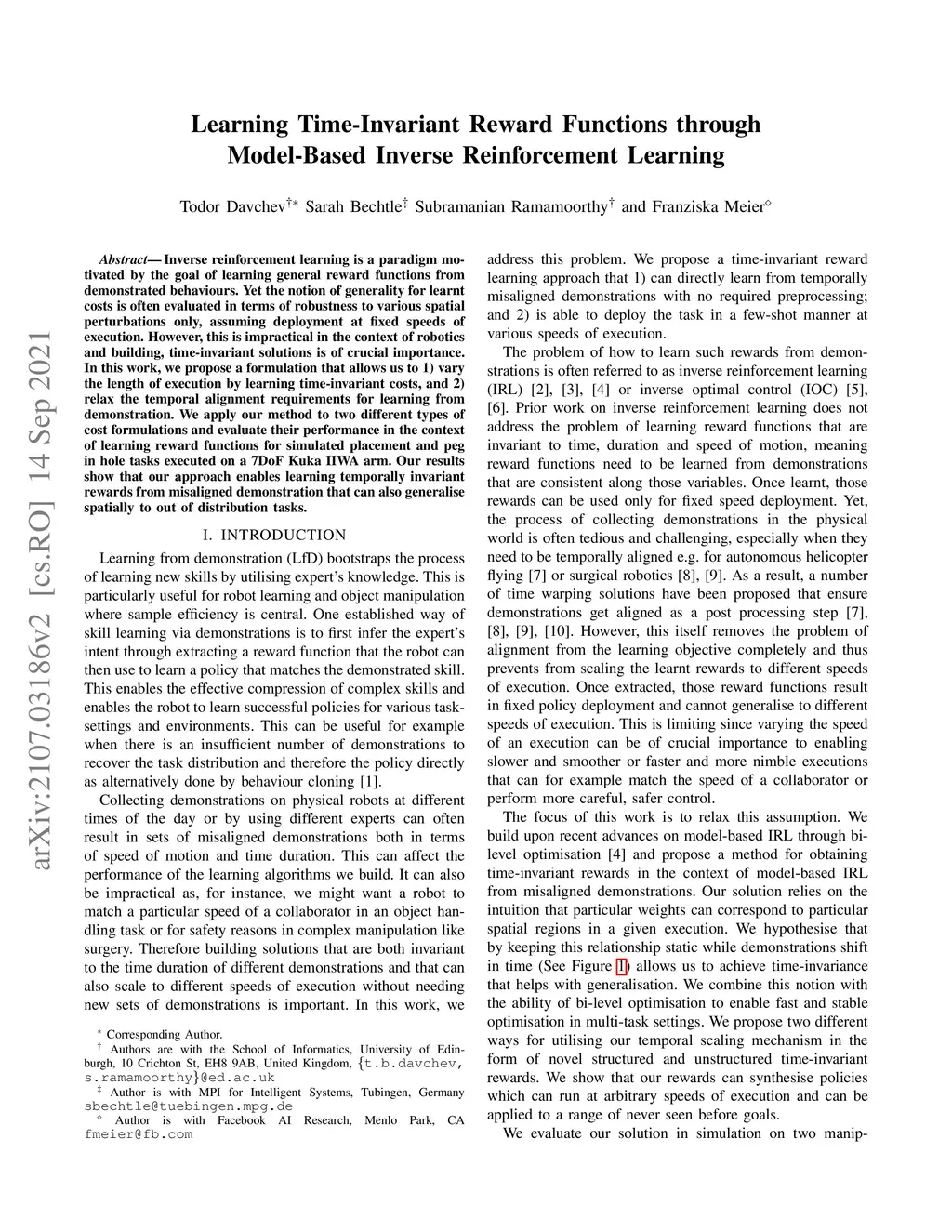 Inverse reinforcement learning is a paradigm motivated by the goal of learning general reward functions from demonstrated behaviours. Yet the notion of generality for learnt costs is often evaluated in terms of robustness to various spatial perturbations only, assuming deployment at fixed speeds of execution. However, this is impractical in the context of robotics and building, time-invariant solutions is of crucial importance. In this work, we propose a formulation that allows us to 1) vary the length of execution by learning time-invariant costs, and 2) relax the temporal alignment requirements for learning from demonstration. We apply our method to two different types of cost formulations and evaluate their performance in the context of learning reward functions for simulated placement and peg in hole tasks executed on a 7DoF Kuka IIWA arm. Our results show that our approach enables learning temporally invariant rewards from misaligned demonstration that can also generalise spatially to out of distribution tasks.