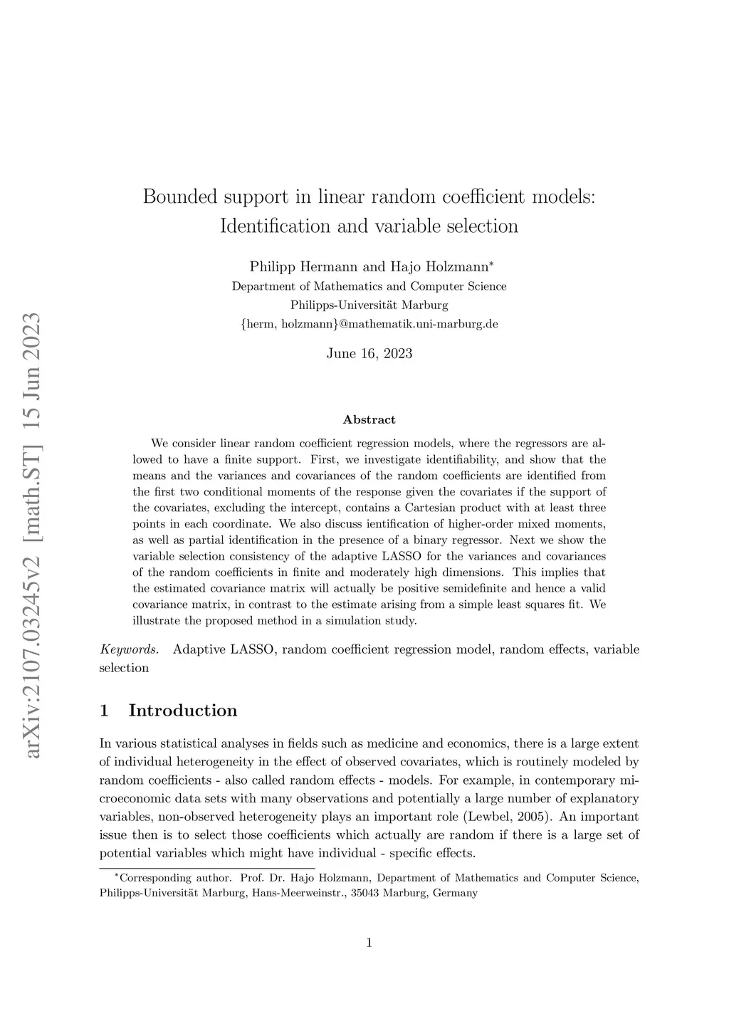 We consider linear random coefficient regression models, where the regressors are allowed to have a finite support. First, we investigate identifiability, and show that the means and the variances and covariances of the random coefficients are identified from the first two conditional moments of the response given the covariates if the support of the covariates, excluding the intercept, contains a Cartesian product with at least three points in each coordinate. We also discuss ientification of higher-order mixed moments, as well as partial identification in the presence of a binary regressor. Next we show the variable selection consistency of the adaptive LASSO for the variances and covariances of the random coefficients in finite and moderately high dimensions. This implies that the estimated covariance matrix will actually be positive semidefinite and hence a valid covariance matrix, in contrast to the estimate arising from a simple least squares fit. We illustrate the proposed method in a simulation study.