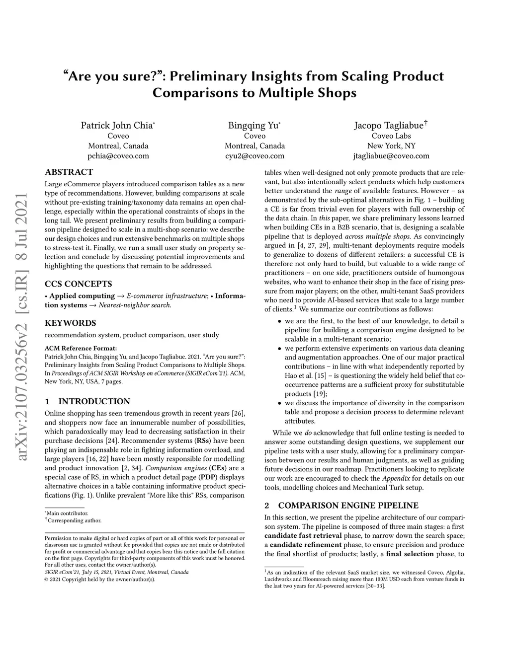 Large eCommerce players introduced comparison tables as a new type of recommendations. However, building comparisons at scale without pre-existing training/taxonomy data remains an open challenge, especially within the operational constraints of shops in the long tail. We present preliminary results from building a comparison pipeline designed to scale in a multi-shop scenario: we describe our design choices and run extensive benchmarks on multiple shops to stress-test it. Finally, we run a small user study on property selection and conclude by discussing potential improvements and highlighting the questions that remain to be addressed.