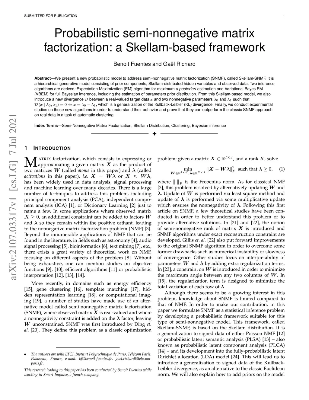 We present a new probabilistic model to address semi-nonnegative matrix factorization (SNMF), called Skellam-SNMF. It is a hierarchical generative model consisting of prior components, Skellam-distributed hidden variables and observed data. Two inference algorithms are derived: Expectation-Maximization (EM) algorithm for maximum \emph{a posteriori} estimation and Variational Bayes EM (VBEM) for full Bayesian inference, including the estimation of parameters prior distribution. From this Skellam-based model, we also introduce a new divergence between a real-valued target data and two nonnegative parameters and such that , which is a generalization of the Kullback-Leibler (KL) divergence. Finally, we conduct experimental studies on those new algorithms in order to understand their behavior and prove that they can outperform the classic SNMF approach on real data in a task of automatic clustering.