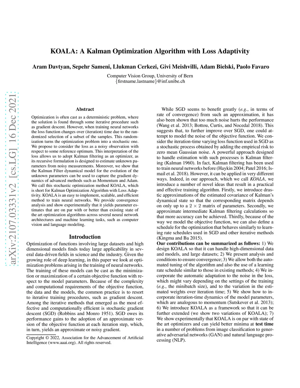 Optimization is often cast as a deterministic problem, where the solution is found through some iterative procedure such as gradient descent. However, when training neural networks the loss function changes over (iteration) time due to the randomized selection of a subset of the samples. This randomization turns the optimization problem into a stochastic one. We propose to consider the loss as a noisy observation with respect to some reference optimum. This interpretation of the loss allows us to adopt Kalman filtering as an optimizer, as its recursive formulation is designed to estimate unknown parameters from noisy measurements. Moreover, we show that the Kalman Filter dynamical model for the evolution of the unknown parameters can be used to capture the gradient dynamics of advanced methods such as Momentum and Adam. We call this stochastic optimization method KOALA, which is short for Kalman Optimization Algorithm with Loss Adaptivity. KOALA is an easy to implement, scalable, and efficient method to train neural networks. We provide convergence analysis and show experimentally that it yields parameter estimates that are on par with or better than existing state of the art optimization algorithms across several neural network architectures and machine learning tasks, such as computer vision and language modeling.