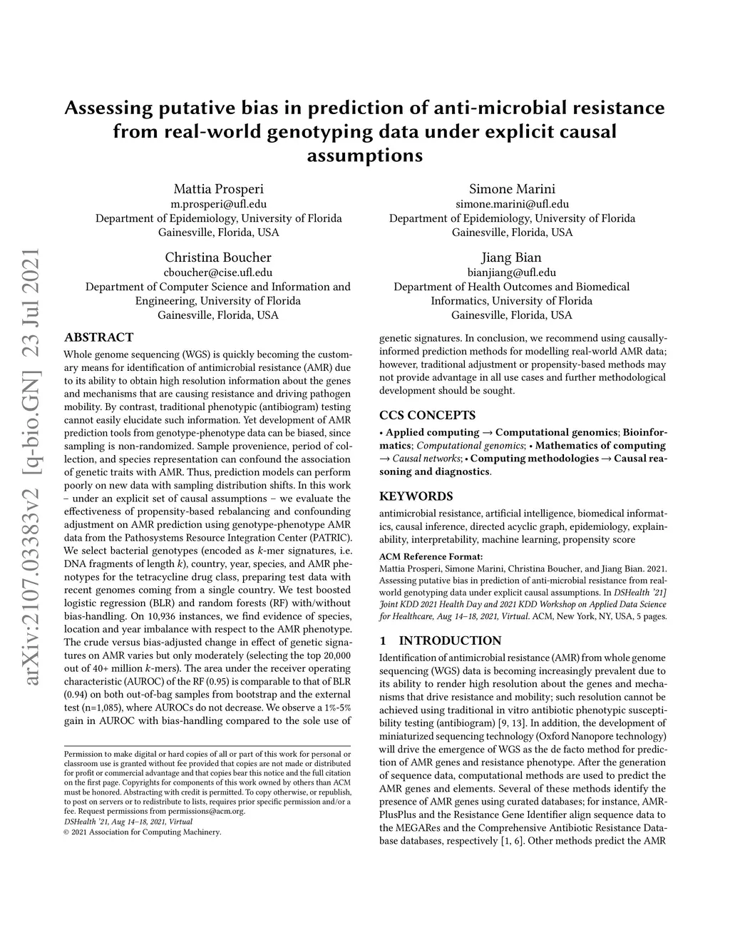 Whole genome sequencing (WGS) is quickly becoming the customary means for identification of antimicrobial resistance (AMR) due to its ability to obtain high resolution information about the genes and mechanisms that are causing resistance and driving pathogen mobility. By contrast, traditional phenotypic (antibiogram) testing cannot easily elucidate such information. Yet development of AMR prediction tools from genotype-phenotype data can be biased, since sampling is non-randomized. Sample provenience, period of collection, and species representation can confound the association of genetic traits with AMR. Thus, prediction models can perform poorly on new data with sampling distribution shifts. In this work -- under an explicit set of causal assumptions -- we evaluate the effectiveness of propensity-based rebalancing and confounding adjustment on AMR prediction using genotype-phenotype AMR data from the Pathosystems Resource Integration Center (PATRIC). We select bacterial genotypes (encoded as k-mer signatures, i.e. DNA fragments of length k), country, year, species, and AMR phenotypes for the tetracycline drug class, preparing test data with recent genomes coming from a single country. We test boosted logistic regression (BLR) and random forests (RF) with/without bias-handling. On 10,936 instances, we find evidence of species, location and year imbalance with respect to the AMR phenotype. The crude versus bias-adjusted change in effect of genetic signatures on AMR varies but only moderately (selecting the top 20,000 out of 40+ million k-mers). The area under the receiver operating characteristic (AUROC) of the RF (0.95) is comparable to that of BLR (0.94) on both out-of-bag samples from bootstrap and the external test (n=1,085), where AUROCs do not decrease. We observe a 1%-5% gain in AUROC with bias-handling compared to the sole use of genetic signatures. ...