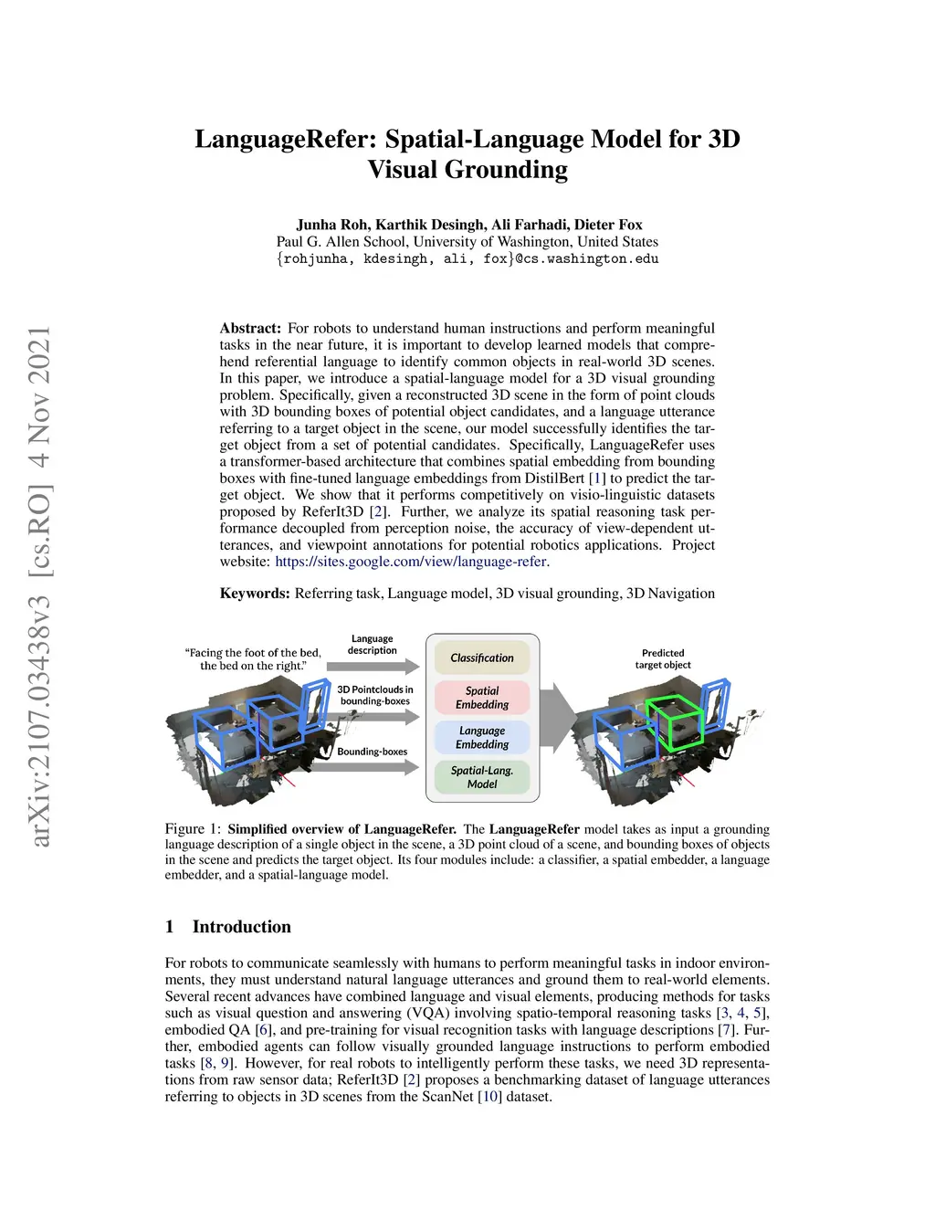 For robots to understand human instructions and perform meaningful tasks in the near future, it is important to develop learned models that comprehend referential language to identify common objects in real-world 3D scenes. In this paper, we introduce a spatial-language model for a 3D visual grounding problem. Specifically, given a reconstructed 3D scene in the form of point clouds with 3D bounding boxes of potential object candidates, and a language utterance referring to a target object in the scene, our model successfully identifies the target object from a set of potential candidates. Specifically, LanguageRefer uses a transformer-based architecture that combines spatial embedding from bounding boxes with fine-tuned language embeddings from DistilBert to predict the target object. We show that it performs competitively on visio-linguistic datasets proposed by ReferIt3D. Further, we analyze its spatial reasoning task performance decoupled from perception noise, the accuracy of view-dependent utterances, and viewpoint annotations for potential robotics applications.