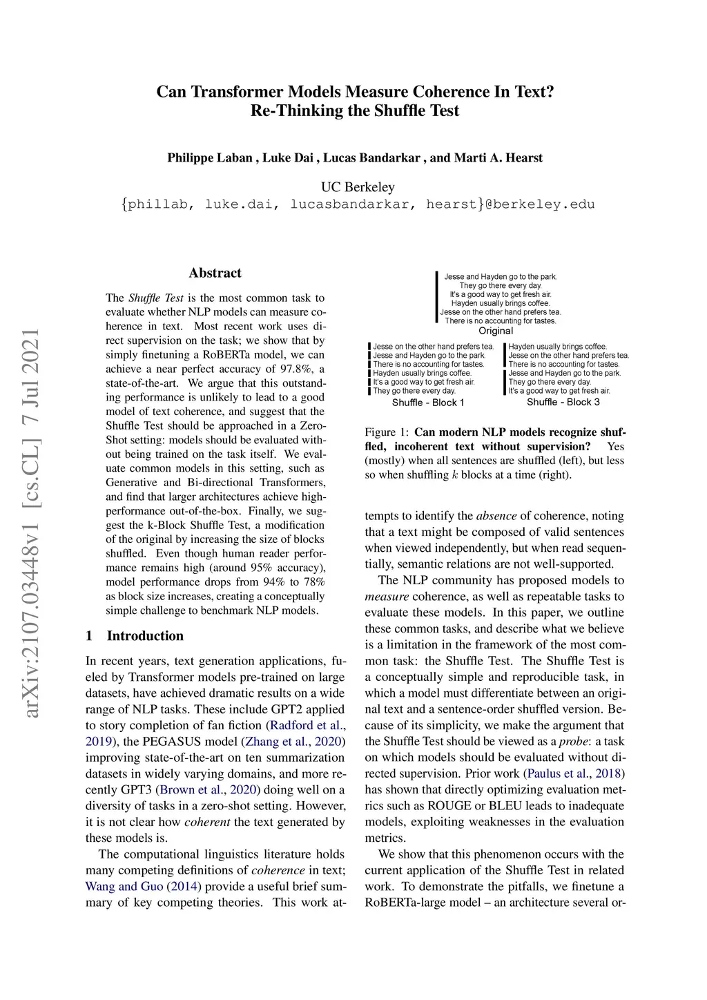 The Shuffle Test is the most common task to evaluate whether NLP models can measure coherence in text. Most recent work uses direct supervision on the task; we show that by simply finetuning a RoBERTa model, we can achieve a near perfect accuracy of 97.8%, a state-of-the-art. We argue that this outstanding performance is unlikely to lead to a good model of text coherence, and suggest that the Shuffle Test should be approached in a Zero-Shot setting: models should be evaluated without being trained on the task itself. We evaluate common models in this setting, such as Generative and Bi-directional Transformers, and find that larger architectures achieve high-performance out-of-the-box. Finally, we suggest the k-Block Shuffle Test, a modification of the original by increasing the size of blocks shuffled. Even though human reader performance remains high (around 95% accuracy), model performance drops from 94% to 78% as block size increases, creating a conceptually simple challenge to benchmark NLP models. Code available: https://github.com/tingofurro/shuffle_test/