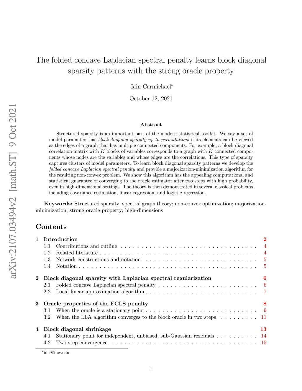 Structured sparsity is an important part of the modern statistical toolkit. We say a set of model parameters has block diagonal sparsity up to permutations if its elements can be viewed as the edges of a graph that has multiple connected components. For example, a block diagonal correlation matrix with K blocks of variables corresponds to a graph with K connected components whose nodes are the variables and whose edges are the correlations. This type of sparsity captures clusters of model parameters. To learn block diagonal sparsity patterns we develop the folded concave Laplacian spectral penalty and provide a majorization-minimization algorithm for the resulting non-convex problem. We show this algorithm has the appealing computational and statistical guarantee of converging to the oracle estimator after two steps with high probability, even in high-dimensional settings. The theory is then demonstrated in several classical problems including covariance estimation, linear regression, and logistic regression.