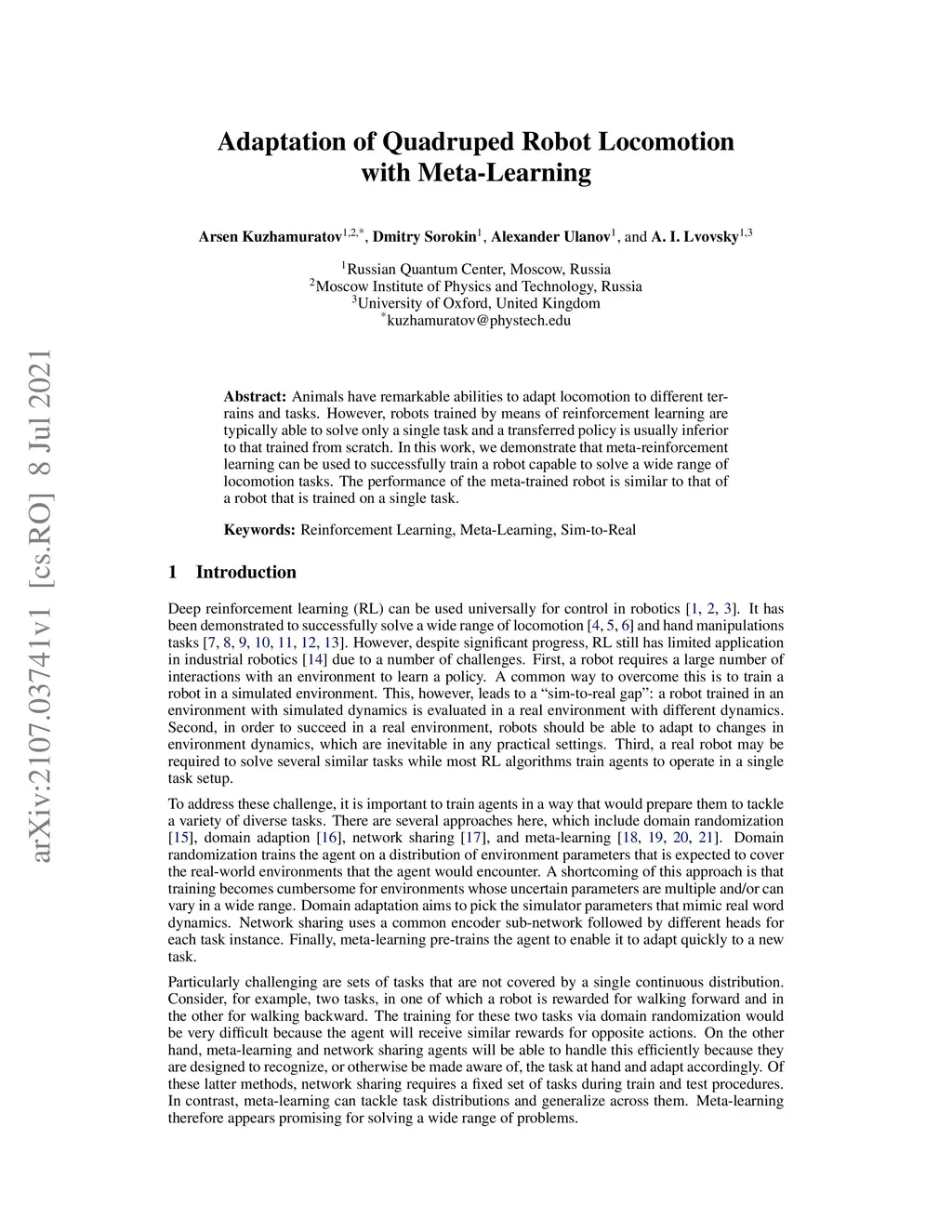 Adaptation of Quadruped Robot Locomotion with Meta-Learning