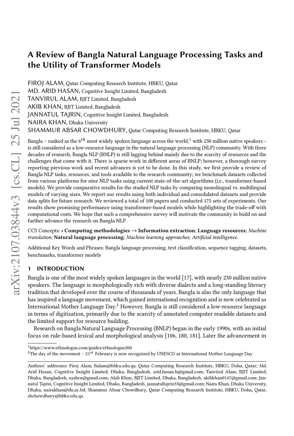 Bangla -- ranked as the 6th most widely spoken language across the world (https://www.ethnologue.com/guides/ethnologue200), with 230 million native speakers -- is still considered as a low-resource language in the natural language processing (NLP) community. With three decades of research, Bangla NLP (BNLP) is still lagging behind mainly due to the scarcity of resources and the challenges that come with it. There is sparse work in different areas of BNLP; however, a thorough survey reporting previous work and recent advances is yet to be done. In this study, we first provide a review of Bangla NLP tasks, resources, and tools available to the research community; we benchmark datasets collected from various platforms for nine NLP tasks using current state-of-the-art algorithms (i.e., transformer-based models). We provide comparative results for the studied NLP tasks by comparing monolingual vs. multilingual models of varying sizes. We report our results using both individual and consolidated datasets and provide data splits for future research. We reviewed a total of 108 papers and conducted 175 sets of experiments. Our results show promising performance using transformer-based models while highlighting the trade-off with computational costs. We hope that such a comprehensive survey will motivate the community to build on and further advance the research on Bangla NLP.