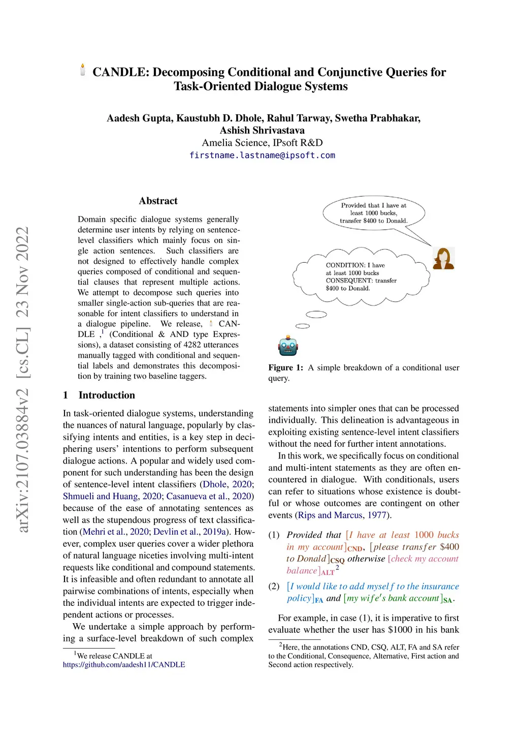 Domain-specific dialogue systems generally determine user intents by relying on sentence level classifiers that mainly focus on single action sentences. Such classifiers are not designed to effectively handle complex queries composed of conditional and sequential clauses that represent multiple actions. We attempt to decompose such queries into smaller single action subqueries that are reasonable for intent classifiers to understand in a dialogue pipeline. We release, CANDLE(Conditional & AND type Expressions), a dataset consisting of 4282 utterances manually tagged with conditional and sequential labels, and demonstrates this decomposition by training two baseline taggers.