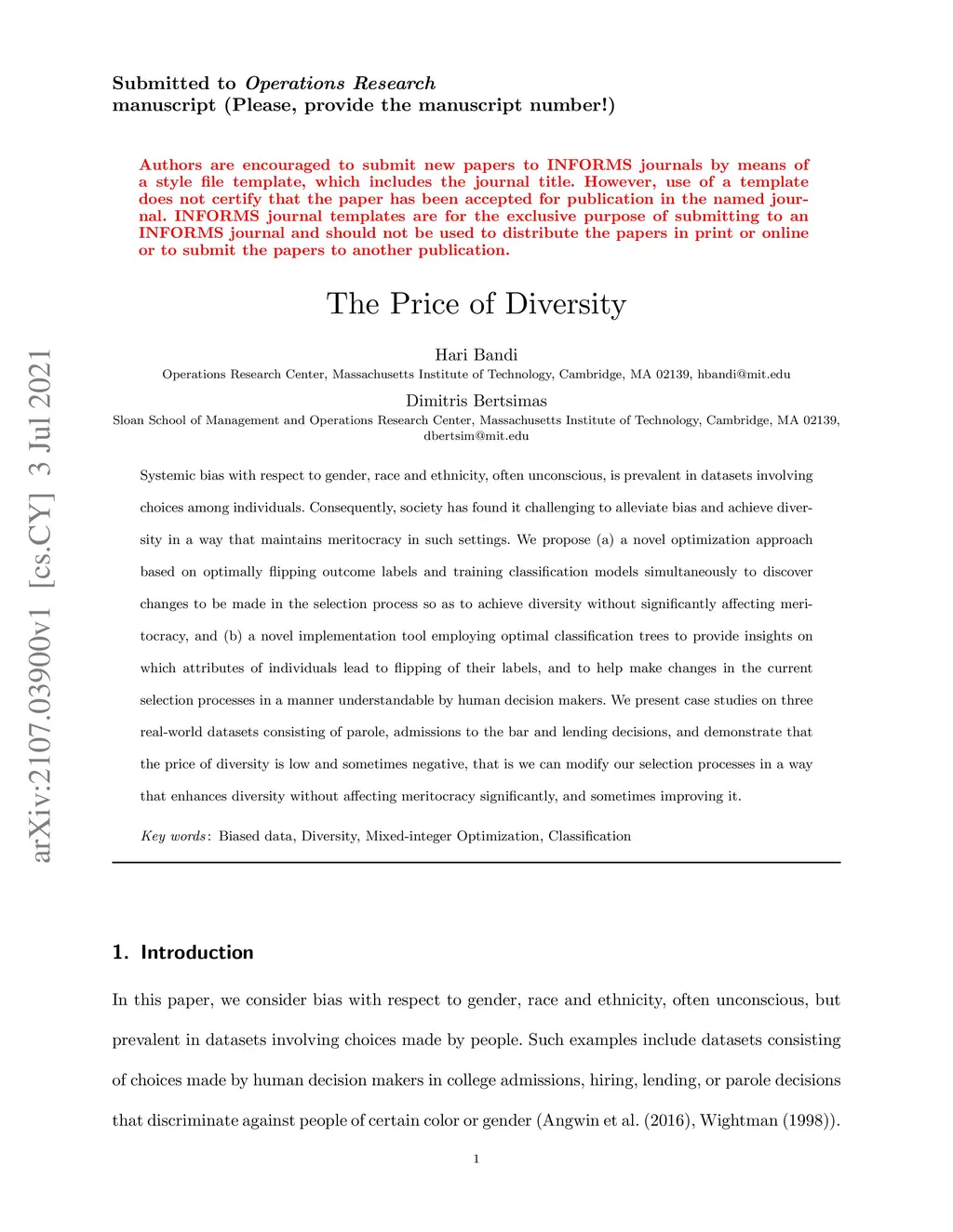 Systemic bias with respect to gender, race and ethnicity, often unconscious, is prevalent in datasets involving choices among individuals. Consequently, society has found it challenging to alleviate bias and achieve diversity in a way that maintains meritocracy in such settings. We propose (a) a novel optimization approach based on optimally flipping outcome labels and training classification models simultaneously to discover changes to be made in the selection process so as to achieve diversity without significantly affecting meritocracy, and (b) a novel implementation tool employing optimal classification trees to provide insights on which attributes of individuals lead to flipping of their labels, and to help make changes in the current selection processes in a manner understandable by human decision makers. We present case studies on three real-world datasets consisting of parole, admissions to the bar and lending decisions, and demonstrate that the price of diversity is low and sometimes negative, that is we can modify our selection processes in a way that enhances diversity without affecting meritocracy significantly, and sometimes improving it.