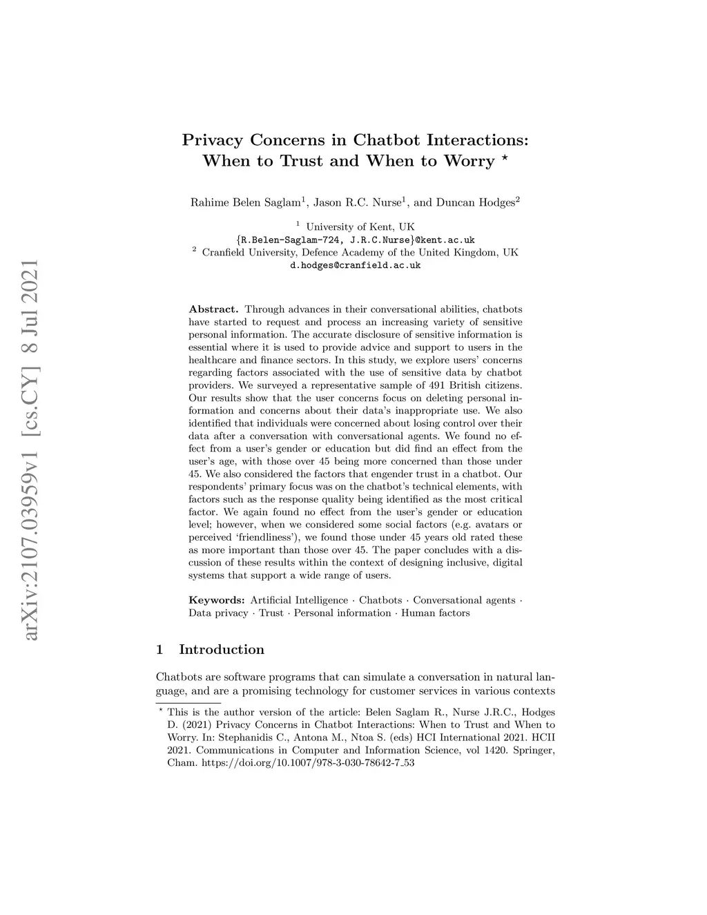 Through advances in their conversational abilities, chatbots have started to request and process an increasing variety of sensitive personal information. The accurate disclosure of sensitive information is essential where it is used to provide advice and support to users in the healthcare and finance sectors. In this study, we explore users' concerns regarding factors associated with the use of sensitive data by chatbot providers. We surveyed a representative sample of 491 British citizens. Our results show that the user concerns focus on deleting personal information and concerns about their data's inappropriate use. We also identified that individuals were concerned about losing control over their data after a conversation with conversational agents. We found no effect from a user's gender or education but did find an effect from the user's age, with those over 45 being more concerned than those under 45. We also considered the factors that engender trust in a chatbot. Our respondents' primary focus was on the chatbot's technical elements, with factors such as the response quality being identified as the most critical factor. We again found no effect from the user's gender or education level; however, when we considered some social factors (e.g. avatars or perceived 'friendliness'), we found those under 45 years old rated these as more important than those over 45. The paper concludes with a discussion of these results within the context of designing inclusive, digital systems that support a wide range of users.
