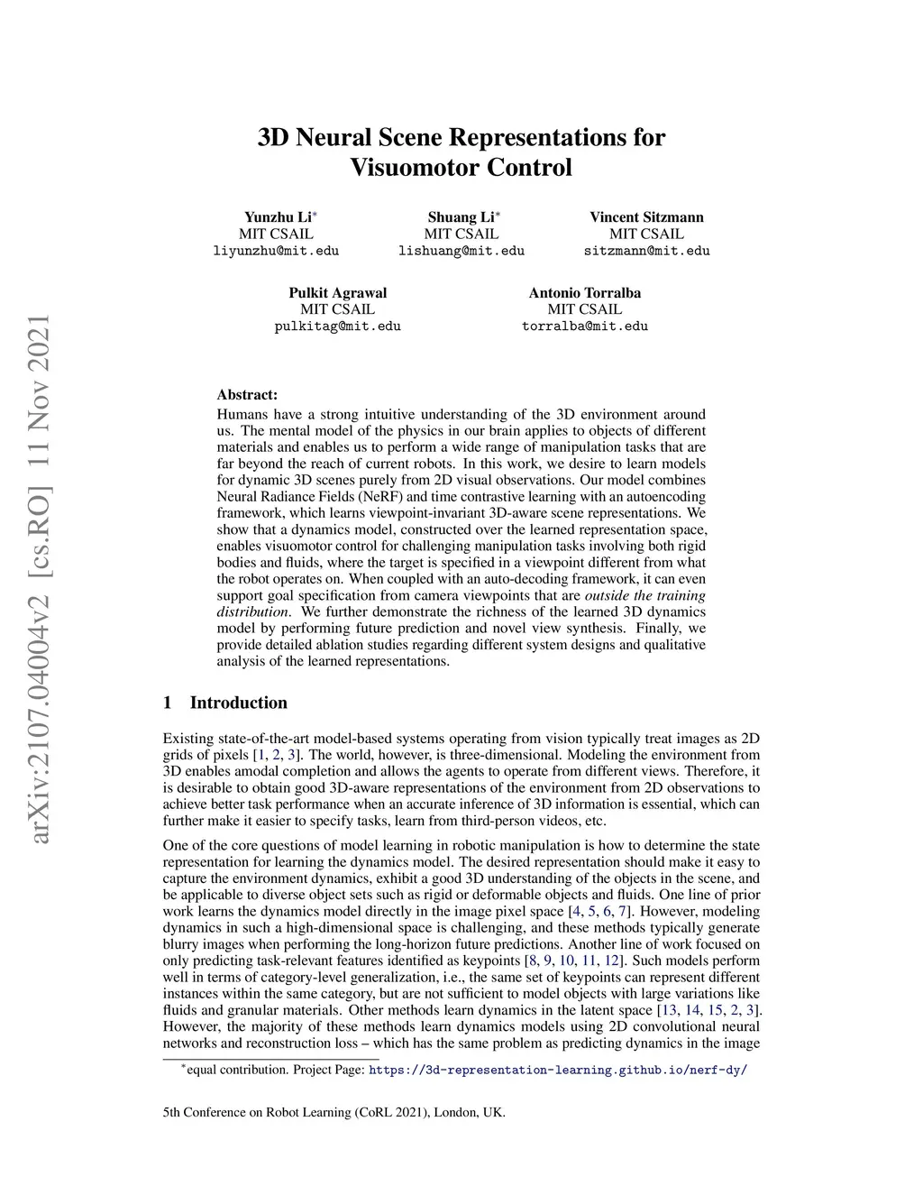 Humans have a strong intuitive understanding of the 3D environment around us. The mental model of the physics in our brain applies to objects of different materials and enables us to perform a wide range of manipulation tasks that are far beyond the reach of current robots. In this work, we desire to learn models for dynamic 3D scenes purely from 2D visual observations. Our model combines Neural Radiance Fields (NeRF) and time contrastive learning with an autoencoding framework, which learns viewpoint-invariant 3D-aware scene representations. We show that a dynamics model, constructed over the learned representation space, enables visuomotor control for challenging manipulation tasks involving both rigid bodies and fluids, where the target is specified in a viewpoint different from what the robot operates on. When coupled with an auto-decoding framework, it can even support goal specification from camera viewpoints that are outside the training distribution. We further demonstrate the richness of the learned 3D dynamics model by performing future prediction and novel view synthesis. Finally, we provide detailed ablation studies regarding different system designs and qualitative analysis of the learned representations.