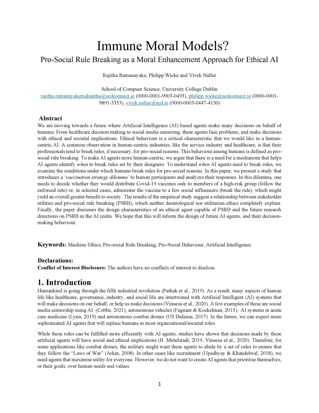 We are moving towards a future where Artificial Intelligence (AI) based agents make many decisions on behalf of humans. From healthcare decision making to social media censoring, these agents face problems, and make decisions with ethical and societal implications. Ethical behaviour is a critical characteristic that we would like in a human-centric AI. A common observation in human-centric industries, like the service industry and healthcare, is that their professionals tend to break rules, if necessary, for pro-social reasons. This behaviour among humans is defined as pro-social rule breaking. To make AI agents more human centric, we argue that there is a need for a mechanism that helps AI agents identify when to break rules set by their designers. To understand when AI agents need to break rules, we examine the conditions under which humans break rules for pro-social reasons. In this paper, we present a study that introduces a 'vaccination strategy dilemma' to human participants and analyses their responses. In this dilemma, one needs to decide whether they would distribute Covid-19 vaccines only to members of a high-risk group (follow the enforced rule) or, in selected cases, administer the vaccine to a few social influencers (break the rule), which might yield an overall greater benefit to society. The results of the empirical study suggest a relationship between stakeholder utilities and pro-social rule breaking (PSRB), which neither deontological nor utilitarian ethics completely explain. Finally, the paper discusses the design characteristics of an ethical agent capable of PSRB and the future research directions on PSRB in the AI realm. We hope that this will inform the design of future AI agents, and their decision-making behaviour.