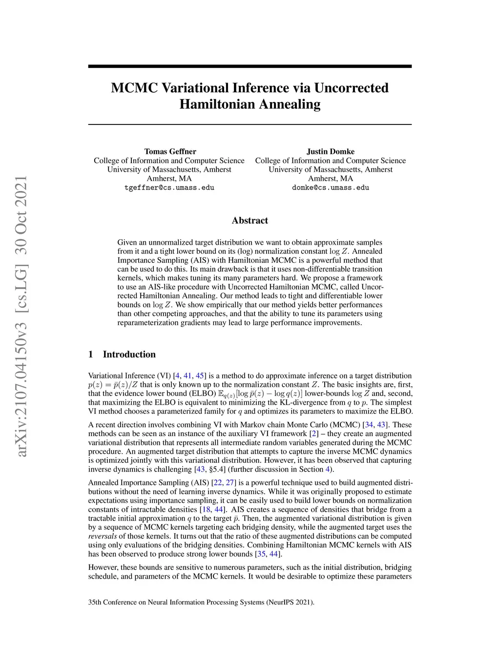 Given an unnormalized target distribution we want to obtain approximate samples from it and a tight lower bound on its (log) normalization constant log Z. Annealed Importance Sampling (AIS) with Hamiltonian MCMC is a powerful method that can be used to do this. Its main drawback is that it uses non-differentiable transition kernels, which makes tuning its many parameters hard. We propose a framework to use an AIS-like procedure with Uncorrected Hamiltonian MCMC, called Uncorrected Hamiltonian Annealing. Our method leads to tight and differentiable lower bounds on log Z. We show empirically that our method yields better performances than other competing approaches, and that the ability to tune its parameters using reparameterization gradients may lead to large performance improvements.