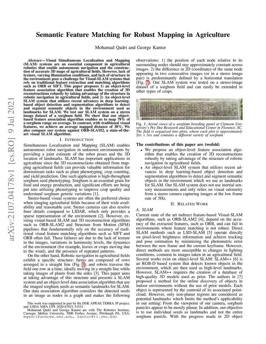 Visual Simultaneous Localization and Mapping (SLAM) systems are an essential component in agricultural robotics that enable autonomous navigation and the construction of accurate 3D maps of agricultural fields. However, lack of texture, varying illumination conditions, and lack of structure in the environment pose a challenge for Visual-SLAM systems that rely on traditional feature extraction and matching algorithms such as ORB or SIFT. This paper proposes 1) an object-level feature association algorithm that enables the creation of 3D reconstructions robustly by taking advantage of the structure in robotic navigation in agricultural fields, and 2) An object-level SLAM system that utilizes recent advances in deep learning-based object detection and segmentation algorithms to detect and segment semantic objects in the environment used as landmarks for SLAM. We test our SLAM system on a stereo image dataset of a sorghum field. We show that our object-based feature association algorithm enables us to map 78% of a sorghum range on average. In contrast, with traditional visual features, we achieve an average mapped distance of 38%. We also compare our system against ORB-SLAM2, a state-of-the-art visual SLAM algorithm.