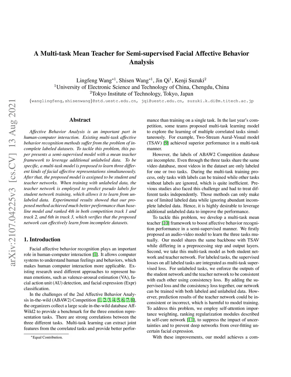 Affective Behavior Analysis is an important part in human-computer interaction. Existing multi-task affective behavior recognition methods suffer from the problem of incomplete labeled datasets. To tackle this problem, this paper presents a semi-supervised model with a mean teacher framework to leverage additional unlabeled data. To be specific, a multi-task model is proposed to learn three different kinds of facial affective representations simultaneously. After that, the proposed model is assigned to be student and teacher networks. When training with unlabeled data, the teacher network is employed to predict pseudo labels for student network training, which allows it to learn from unlabeled data. Experimental results showed that our proposed method achieved much better performance than baseline model and ranked 4th in both competition track 1 and track 2, and 6th in track 3, which verifies that the proposed network can effectively learn from incomplete datasets.