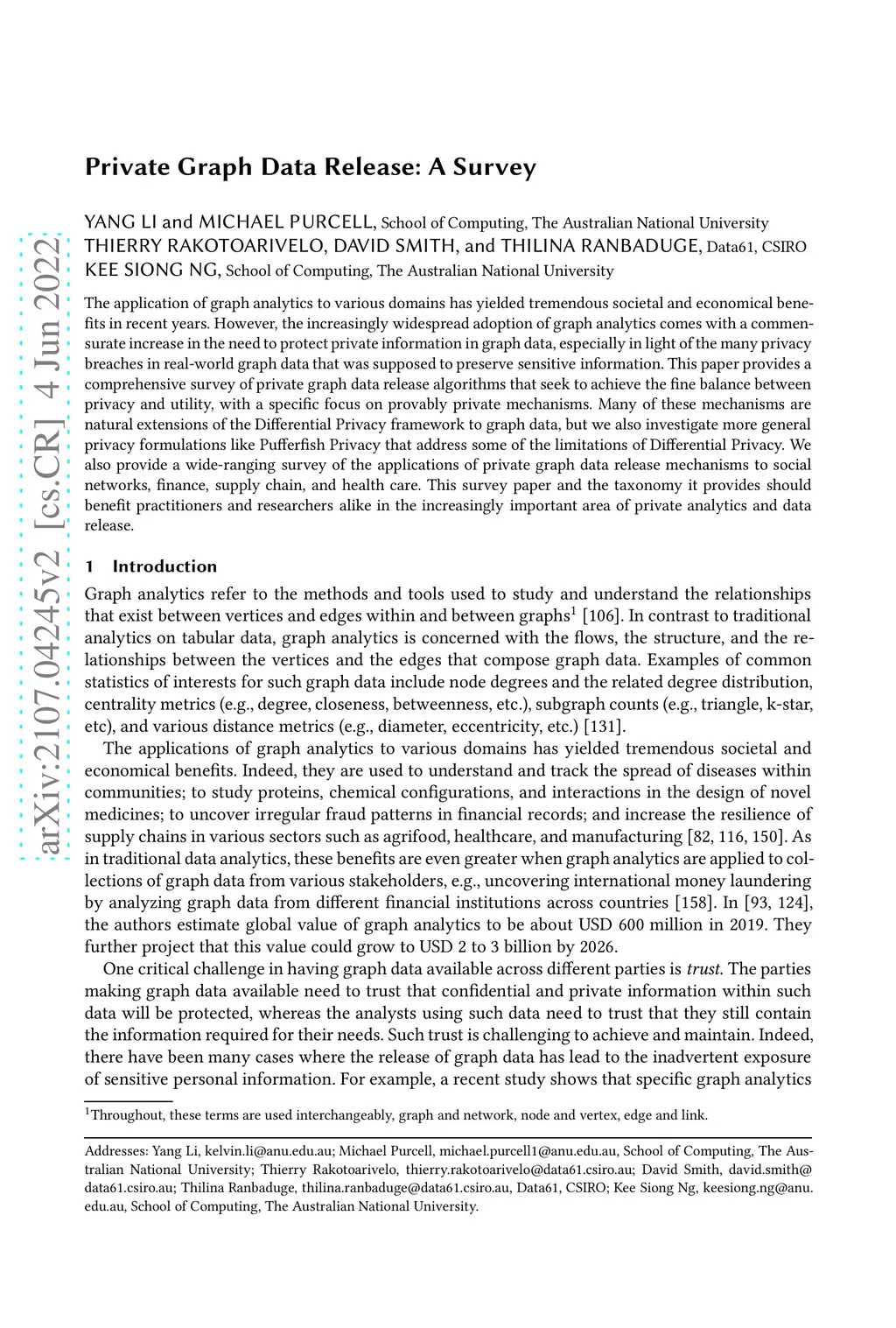 The application of graph analytics to various domains has yielded tremendous societal and economical benefits in recent years. However, the increasingly widespread adoption of graph analytics comes with a commensurate increase in the need to protect private information in graph data, especially in light of the many privacy breaches in real-world graph data that was supposed to preserve sensitive information. This paper provides a comprehensive survey of private graph data release algorithms that seek to achieve the fine balance between privacy and utility, with a specific focus on provably private mechanisms. Many of these mechanisms are natural extensions of the Differential Privacy framework to graph data, but we also investigate more general privacy formulations like Pufferfish Privacy that address some of the limitations of Differential Privacy. We also provide a wide-ranging survey of the applications of private graph data release mechanisms to social networks, finance, supply chain, and health care. This survey paper and the taxonomy it provides should benefit practitioners and researchers alike in the increasingly important area of private analytics and data release.