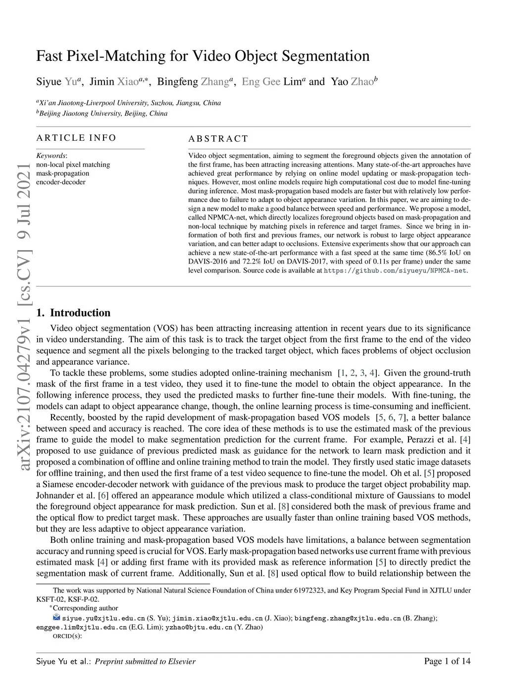 Video object segmentation, aiming to segment the foreground objects given the annotation of the first frame, has been attracting increasing attentions. Many state-of-the-art approaches have achieved great performance by relying on online model updating or mask-propagation techniques. However, most online models require high computational cost due to model fine-tuning during inference. Most mask-propagation based models are faster but with relatively low performance due to failure to adapt to object appearance variation. In this paper, we are aiming to design a new model to make a good balance between speed and performance. We propose a model, called NPMCA-net, which directly localizes foreground objects based on mask-propagation and non-local technique by matching pixels in reference and target frames. Since we bring in information of both first and previous frames, our network is robust to large object appearance variation, and can better adapt to occlusions. Extensive experiments show that our approach can achieve a new state-of-the-art performance with a fast speed at the same time (86.5% IoU on DAVIS-2016 and 72.2% IoU on DAVIS-2017, with speed of 0.11s per frame) under the same level comparison. Source code is available at https://github.com/siyueyu/NPMCA-net.
