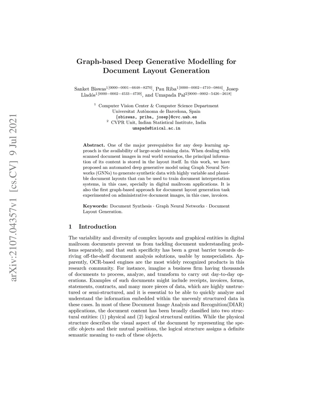 One of the major prerequisites for any deep learning approach is the availability of large-scale training data. When dealing with scanned document images in real world scenarios, the principal information of its content is stored in the layout itself. In this work, we have proposed an automated deep generative model using Graph Neural Networks (GNNs) to generate synthetic data with highly variable and plausible document layouts that can be used to train document interpretation systems, in this case, specially in digital mailroom applications. It is also the first graph-based approach for document layout generation task experimented on administrative document images, in this case, invoices.