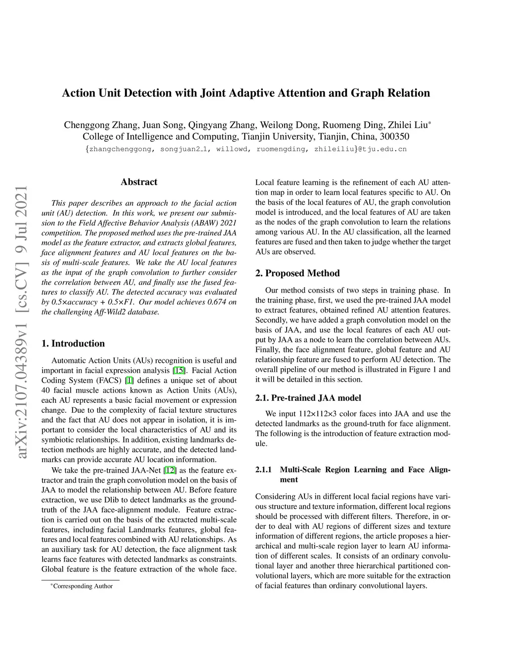 This paper describes an approach to the facial action unit (AU) detection. In this work, we present our submission to the Field Affective Behavior Analysis (ABAW) 2021 competition. The proposed method uses the pre-trained JAA model as the feature extractor, and extracts global features, face alignment features and AU local features on the basis of multi-scale features. We take the AU local features as the input of the graph convolution to further consider the correlation between AU, and finally use the fused features to classify AU. The detected accuracy was evaluated by 0.5*accuracy + 0.5*F1. Our model achieves 0.674 on the challenging Aff-Wild2 database.